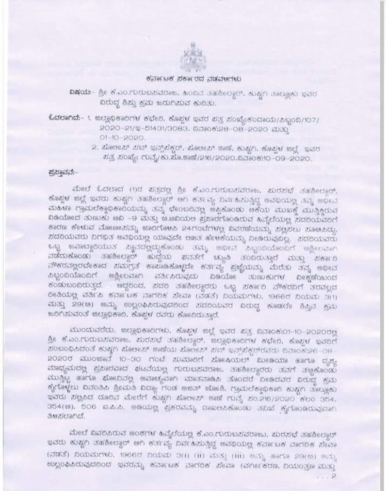 ಈ ಸಂಬಂಧ ನೊಂದ ಮಹಿಳೆ ಕುಷ್ಟಗಿ ಪೊಲೀಸ್ ಠಾಣೆಯಲ್ಲಿ ಪ್ರಕರಣ ದಾಖಲಿಸಿದ್ದರು. ಪ್ರಕರಣವನ್ನ ಕೂಲಂಕುಶವಾಗಿ ಪರಿಶೀಲಿಸಿದ ಬಳಿಕ ಅಧಿಕಾರ ಘನತೆಗೆ ಚ್ಯುತಿ ತಂದಿದ್ದ ಹಿನ್ನಲೆಯಲ್ಲಿ ತಹಶೀಲ್ದಾರ್ ಕೆ.ಎಂ.ಗುರುಬಸವರಾಜ ಅವರನ್ನ ಅಮಾನತು ಮಾಡಲಾಗಿದೆ. ಅಮಾನತ್ತುಗೊಂಡ ಗುರುಬಸವರಾಜ ಸದ್ಯ ಬೀದರ್ನಲ್ಲಿ ಚುನಾವಣಾ ತಹಶೀಲ್ದಾರಾಗಿ ಕಾರ್ಯನಿರ್ವಹಿಸುತ್ತಿದ್ದಾರೆ.