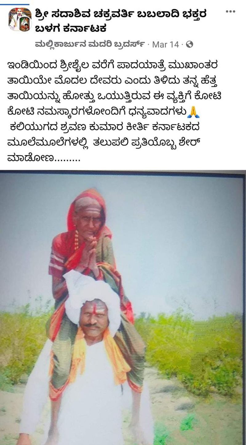 ಆಧುನಿಕ ಶ್ರವಣಕುಮಾರ ಅಣ್ಣಾರಾಯ ತಮ್ಮ ತಾಯಿ ಲೀಲಾಬಾಯಿಯನ್ನ ಹೆಗಲ ಮೇಲೆ ಹೊತ್ತು ಪಾದಯಾತ್ರೆ ಮಾಡಿದ್ದು ಮೂರು ವರ್ಷಗಳ ಹಿಂದೆ ಆದ್ರು, ಈಗಲೂ ತಾಯಿಯನ್ನ ಹೊತ್ತು ನಡೆದು ಸಾಗ್ತಿರೋ ಇವರ ಪೋಟೊ (Viral Photo) ಒಂದು ವೈರಲ್ ಆಗುತ್ತಲೆ ಇರುತ್ತೆ. ಕಳೆದ 4 ವರ್ಷಗಳಿಂದ ಹೋಳಿ ಹುಣ್ಣಿಮೆ ಬಳಿಕ ಈ ಪೋಟೊ ಪೇಸ್ಬುಕ್, ವಾಟ್ಸಾಪ್, ಇನ್ಸಟಾಗಳಲ್ಲಿ ವೈರಲ್ ಆಗುತ್ತೆ. ತಾಯಿಯನ್ನ ಹೊತ್ತುಕೊಂಡು ಪಾದಯಾತ್ರೆ ಹೊರಟ ಆಧುನಿಕ ಶ್ರವಣಕುಮಾರ ಅಣ್ಣಾರಾಯರಿಗೆ ಶುಭವಾಗಲಿ ಎನ್ನುವ ಪೋಸ್ಟ್ ಗಳು ಹರಿದಾಡುತ್ವೆ..