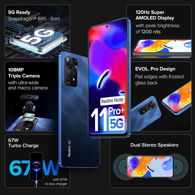 Redmi Note 11 Pro+ ಫೀಚರ್ಸ್: 6.67-ಇಂಚಿನ ಪೂರ್ಣ HD+ AMOLED ಡಿಸ್ಪ್ಲೇ, 120Hz ರಿಫ್ರೆಶ್ ದರ | Qualcomm Snapdragon 695 ಪ್ರೊಸೆಸರ್ ಜೊತೆಗೆ 5G | 6GB ಅಥವಾ 8GB RAM| 128GB ಅಥವಾ 256GB ಸಂಗ್ರಹ | 108MP+8MP+2MP ಕ್ಯಾಮರಾ | 16MP ಮುಂಭಾಗದ ಕ್ಯಾಮರಾ | Android 11 ನಲ್ಲಿ MIUI 13 |