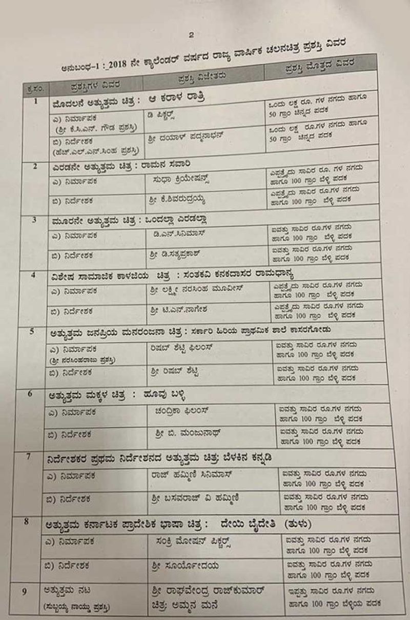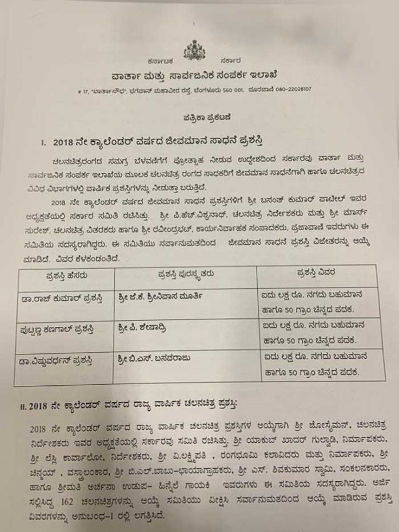 2018 ನೇ ಸಾಲಿನ ರಾಜ್ಯ ಚಲನಚಿತ್ರವ ಪ್ರಶಸ್ತಿ ಘೋಷಣೆ: