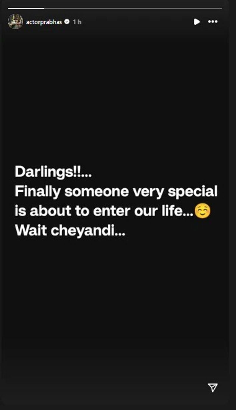 ತೆಲುಗು ಸೂಪರ್ಸ್ಟಾರ್ ಪ್ರಭಾಸ್ ಇನ್ಸ್ಟಾಗ್ರಾಮ್ನಲ್ಲಿ ಕುತೂಹಲದ ಪೋಸ್ಟ್ಅನ್ನು ಹಂಚಿಕೊಂಡಿದ್ದಾರೆ. ಮೇ.17 ರಂದು ಅವರು ಇನ್ಸ್ಟಾಗ್ರಾಮ್ ಸ್ಟೋರೀಸ್ ಮೂಲಕ ಕ್ರಿಪ್ಟಿಕ್ ನೋಟ್ಅನ್ನು ಹಂಚಿಕೊಂಡಿದ್ದು, ತಮ್ಮ ಜೀವನದಲ್ಲಿ ವಿಶೇಷವಾಗಿರೋರು ಬರ್ತಾರೆ ಅನ್ನೋ ಸುಳಿವನ್ನೂ ಅವರು ನೀಡಿದ್ದಾರೆ. ಅದರೊಂದಿಗೆ ತಮ್ಮ ಅಭಿಮಾನಿಗಳಿಗೂ ಸರ್ಪ್ರೈಸ್ ನೀಡಿರುವ ಪ್ರಭಾಸ್, ತಾವು ಅದನ್ನು ತಿಳಿಸುವವರೆಗೂ ನೀವು ಅದನ್ನು ಅಂದಾಜು ಮಾಡುತ್ತಲೇ ಇರಿ ಎಂದೂ ಬರೆದುಕೊಂಡಿದ್ದಾರೆ. ಅವರ ಬಹು ನಿರೀಕ್ಷಿತ ಚಿತ್ರ 'ಕಲ್ಕಿ: 2898 AD' ಬಿಡುಗಡೆಗೆ ಮುಂಚಿತವಾಗಿ, ಪ್ರಭಾಸ್ ಪೋಸ್ಟ್ ಅನ್ನು ಹಂಚಿಕೊಂಡಿದ್ದಾರೆ, "ಡಾರ್ಲಿಂಗ್ಸ್!! ಅಂತಿಮವಾಗಿ ಒಬ್ಬರು ನಮ್ಮ ಜೀವನದಲ್ಲಿ (ಸ್ಮೈಲಿ ಎಮೋಜಿ) ಪ್ರವೇಶಿಸಲಿದ್ದಾರೆ (ಸ್ಮೈಲಿ ಎಮೋಜಿ). ದಯವಿಟ್ಟು ನಿರೀಕ್ಷಿಸಿ (sic)' ಎಂದು ಬರೆದುಕೊಂಡಿದ್ದಾರೆ.