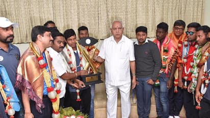 ಬೆಂಗಳೂರು (ಫೆ.13): ಚಿನ್ನಸ್ವಾಮಿ ಕ್ರೀಡಾಂಗಣದಲ್ಲಿ ನಿನ್ನೆ ನಡೆದ ವಿಶ್ವಾಂಧರ ಟಿ20 ವಿಶ್ವಕಪ್ ನಲ್ಲಿ ಭಾರತ ತಂಡ ಪಾಕ್ ವಿರುದ್ಧ ಭರ್ಜರಿ ಜಯ ಪಡೆದಿದೆ. ಈ ಮೂಲಕ ಭಾರತ ತಂಡ 2 ನೇ ಬಾರಿಗೆ ಚಾಂಪಿಯನ್ ಶಿಪ್ ಉಳಿಸಿಕೊಂಡಿದೆ. ಟಿ20 ಯಲ್ಲಿ ಗೆದ್ದ ಭಾರತೀಯ ತಂಡವನ್ನು ಇಂದು ಬಿಜೆಪಿ ರಾಜ್ಯಾಧ್ಯಕ್ಷ ಬಿ.ಎಸ್. ಯಡಿಯೂರಪ್ಪ ಸನ್ಮಾನಿಸಿದರು. ತಂಡದ ಸದಸ್ಯರ ಶ್ರಮವನ್ನು ಯಡಿಯೂರಪ್ಪ ಶ್ಲಾಘಿಸಿದ್ದಾರೆ.