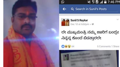 ಡಿಸೆಂಬರ್ 12 ರಂದು ಸಂಜೆ 6 ಗಂಟೆಗೆ ಫೇಸ್'ಬುಕ್ ಸ್ಟೇಟಸ್'ನ್ನು ಅಪ್'ಡೇಟ್ ಮಾಡಿದ್ದ ಸುನೀಲ್ ರಾಯ್ಕರ್ 'ಲೇ ಮುಖ್ಯಮಂತ್ರಿ ನಮ್ಮ ಊರಿಗೆ ಬಂದ್ರೇ ನಿನ್ನನ್ನ ಕೊಂದೆ ಬಿಡತ್ತಾರೆಲೇ' ಎಂದು ಬರೆದುಕೊಂಡಿದ್ದಾರೆ. ಅಲ್ಲದೇ ಸಿಎಂ ಸಿದ್ಧರಾಮಯ್ಯರನ್ನು ಅವಾಚ್ಯ ಪದಗಳಿಂದ ನಿಂದಿಸಿದ ಇತರ ಪೋಸ್ಟ್'ಗಳನ್ನೂ ಅಪ್'ಡೇಟ್ ಮಾಡಿದ್ದಾನೆ.