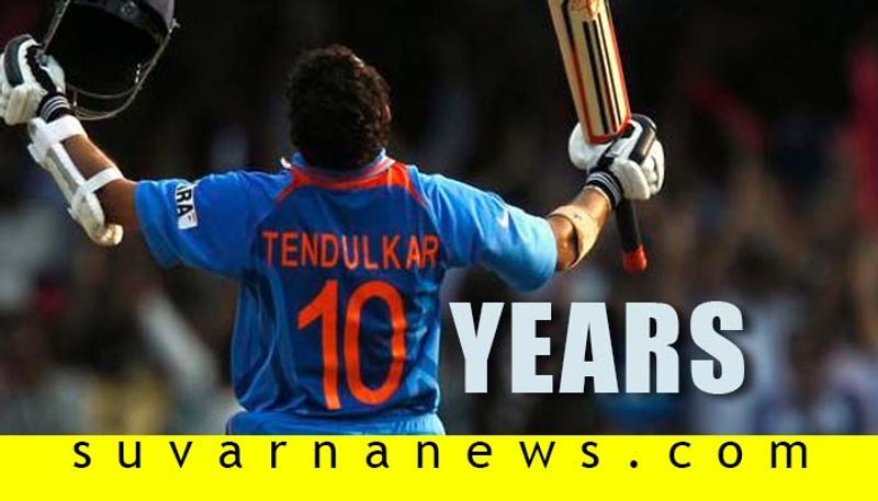 ಕ್ರಿಕೆಟ್ನ ಬಹುತೇಕ ಎಲ್ಲಾ ದಾಖಲೆಗಳು ಆರಂಭವಾವುದು ಮಾಸ್ಟರ್ ಬ್ಲಾಸ್ಟರ್ ಸಚಿನ್ ತೆಂಡುಲ್ಕರ್ ಹೆಸರಿನಿಂದ. ಏಕದಿನ ಕ್ರಿಕೆಟ್ನಲ್ಲಿ ಮೊಟ್ಟ ಮೊದಲ ಬಾರಿಗೆ ದ್ವಿಶತಕ ಸಿಡಿಸಿದ ದಾಖಲೆಯೂ ಸಚಿನ್ ಹೆಸರಿಗಿದೆ. ಸಚಿನ್ ಬಳಿಕ ಹಲವು ದ್ವಿಶತಕ ದಾಖಲಾಗಿದೆ. ಇದೀಗ ಸಚಿನ್ ಸಾಧನೆಗೆ 10 ವರ್ಷದ ಸಂಭ್ರಮ.
