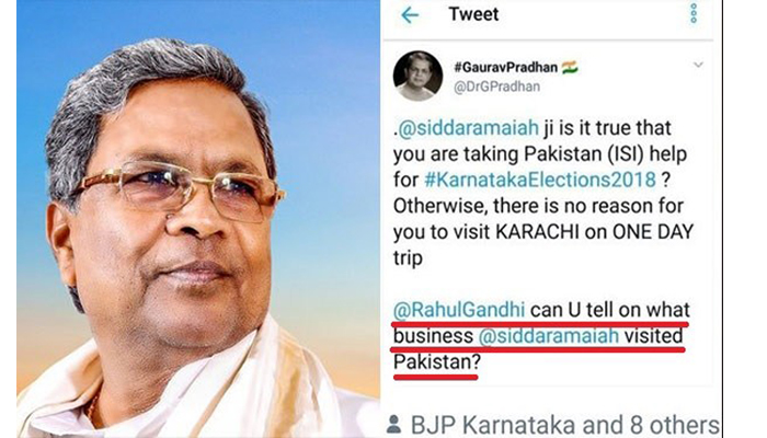 ಸಿಎಂ ಸಿದ್ದರಾಮಯ್ಯ ಹಾಗೂ ಜಮೀರ್ ಅಹಮದ್ ಖಾನ್, ಕಳೆದ ಏ.13ರಂದು ಒಂದು ದಿವಸದ ಮಟ್ಟಿಗೆ ಪಾಕಿಸ್ತಾನಕ್ಕೆ ಭೇಟಿ ನೀಡಿದ್ದರು, ಕರ್ನಾಟಕ ಚುನಾವಣೆ ಗೆಲ್ಲಲು ಐಎಸ್ಐ ಸಹಾಯ ಪಡೆಯುವ ಉದ್ದೇಶವೇ? ಕರಾಚಿಗೆ ಭೇಟಿ ನೀಡಿರುವ ಉದ್ದೇಶವೇನು ಎಂದು, ಸುಮಾರು 1ಲಕ್ಷ ಫಾಲೋವರ್ಸ್’ಗಳಿರುವ ಡಾ. ಗೌರವ್ ಪ್ರಧಾನ್ ಎಂಬವರು ಟ್ವೀಟಿಸಿದ್ದರು.