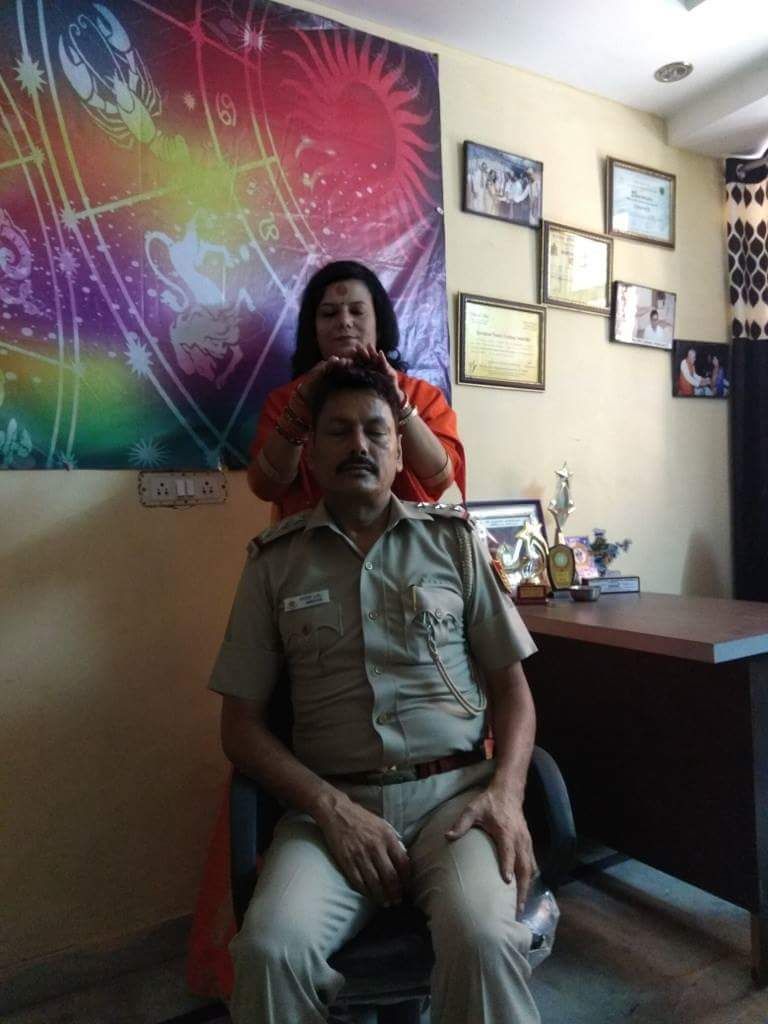 ದೆಹಲಿಯ ಜಾನಕಿಪುರಿ ಪೊಲೀಸ್ ಠಾಣೆಯಲ್ಲಿ ಠಾಣಾಧಿಕಾರಿ ಇಂದರ್ ಲಾಲ್, ಸ್ವಯಂ ಘೋಷಿತ ದೇವ ಮಹಿಳೆ ನಮಿತಾ ಆಚಾರ್ಯ ಅವರೊಂದಿಗೆ ಇರುವ ಫೋಟೋ ಇದಾಗಿದೆ. ಕುರ್ಚಿಯೊಂದರ ಮೇಲೆ ಕುಳಿತಿರುವ ಪೊಲೀಸ್ ಅಧಿಕಾರಿಯ ತಲೆಯ ಕೂದಲನ್ನು ಮಹಿಳೆ ಮಸಾಜ್ ಮಾಡುತ್ತಿರುವ ದೃಶ್ಯ ಬಿತ್ತರವಾಗಿದೆ.