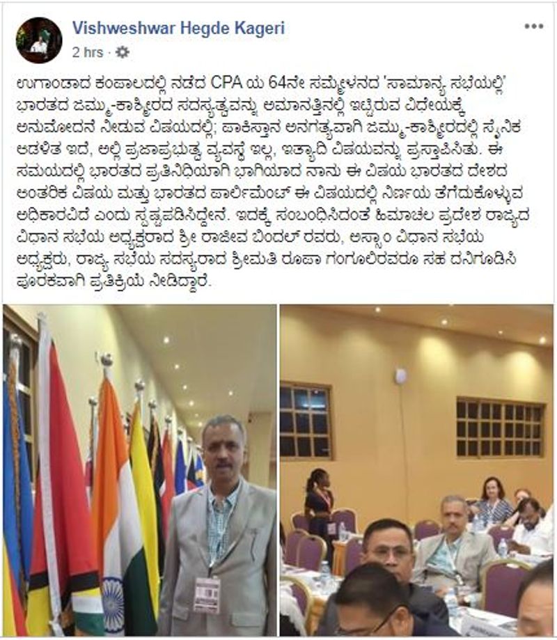 ಈ ಸಮಯದಲ್ಲಿ ಭಾರತದ ಪ್ರತಿನಿಧಿಯಾಗಿದ್ದ ಕರ್ನಾಟಕದ ವಿಧಾನಸಭಾ ಅಧ್ಯಕ್ಷರಾದ ವಿಶ್ವೇಶ್ವರ ಹೆಗಡೆ ಕಾಗೇರಿ, ‘ಕಾಶ್ಮೀರದ ವಿಷಯ ಭಾರತದ ಆಂತರಿಕ ಸಂಗತಿ ಮತ್ತು ಭಾರತದ ಪಾರ್ಲಿ ಮೆಂಟ್ ನಿರ್ಣಯ ಕೈಗೊಳ್ಳಲಿದೆ’ ಎಂದರು. ಇದೇ ವೇಳೆ ಮಾತನಾಡಿದ ಹಿಮಾಚಲ ಪ್ರದೇಶ ಸ್ಪೀಕರ್, ರಾಜೀವ್ ಬಿಂದಾಲ್, ಈ ಸಮ್ಮೇಳನದಲ್ಲಿ ಭಾರತದ ಆಂತರಿಕ ವಿಷಯ ಪ್ರಸ್ತಾಪಿಸಿರುವುದು ಸರಿಯಲ್ಲ ಎಂದರು.