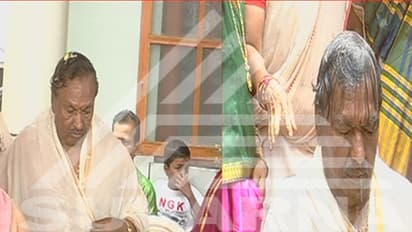 ಶಿವಮೊಗ್ಗ(ಏ.28): ಬೆಂಗಳೂರಿನಲ್ಲಿ ಬಿಜೆಪಿ ಅತೃಪ್ತರ ಸಭೆ ನಡೆಸಿ ಬಿಜೆಪಿಯಲ್ಲಿ ಅಸಮಾಧಾನ ಹೊಗೆ ಭುಗಿಲೇಳುವಂತೆ ಮಾಡಿ ತವರು ಶಿವಮೊಗ್ಗಕ್ಕೆ ವಾಪಾಸಾಗಿದ್ದ ವಿಪಕ್ಷ ನಾಯಕ ಕೆ.ಎಸ್.ಈಶ್ವರಪ್ಪ ಮನೆಯಲ್ಲಿ ಆಶ್ಲೇಷಾ ಬಲಿ ಪೂಜೆ ನಡೆಸಿ ಗಮನ ಸೆಳೆದರು.