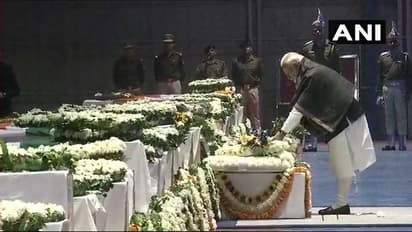 ನವದೆಹಲಿ(ಫೆ.15): ಪುಲ್ವಾಮಾ ಭಯೋತ್ಪಾದಕ ದಾಳಿಯಲ್ಲಿ ಹುತಾತ್ಮರಾದ CRPF ವೀರ ಯೋಧರಿಗೆ ನವದೆಹಲಿಯಲ್ಲಿ ಗಣ್ಯರಿಂದ ಅಂತಿಮ ನಮನ ಸಲ್ಲಿಸಲಾಯಿತು.