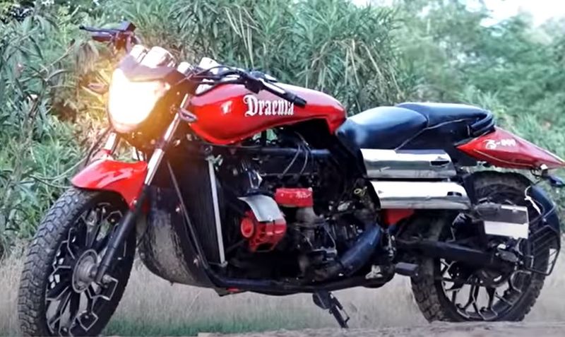 ಮಾರುತಿ 800 ಕಾರಿನ ಎಂಜಿನ್, ರಾಯಲ್ ಎನ್ಫೀಲ್ಡ್ ಬೈಕ್ನ ಬಿಡಿ ಭಾಗ, ಟಾಟಾ ಏಸ್ ಕಾರಿನ ಕ ಬಿಡಿ ಭಾಗ, ಯಮಹಾ FZ ಬೈಕ್ ಬಿಡಿ ಭಾಗಳನ್ನು ಬಳಸಿಕೊಂಡು ವಿನೂತನ ಬೈಕ್ ನಿರ್ಮಾಣ ಮಾಡಲಾಗಿದೆ. ಇಬ್ಬರು ಯುವಕರ ಪ್ರಯತ್ನದಿಂದ ಹೊಸ ಬೈಕ್ ಎಲ್ಲರ ಗಮನಸಳೆಯುತ್ತಿದೆ.