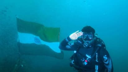 ಪಾಂಡಿಚೇರಿ(ಆ.15): ಶಾಲಾ,ಕಾಲೇಜು, ಕಚೇರಿಯಲ್ಲಿ, ಕಟ್ಟಡ ಸೇರಿದಂತೆ ವಿವಿದೆಡೆ ಭಾರತೀಯರು ಸ್ವಾತಂತ್ರ್ಯ ದಿನಾಚರಣೆ ಆಚರಿಸುತ್ತಾರೆ. ಆದರೆ ಪಾಂಡಿಚೇರಿಯ ಡೈವಿಂಗ್ ಸ್ಕೂಲ್ನ ತರಬೇತುದಾರ ಎಸ್.ಬಿ.ಅರವಿಂದ ವಿಶೇಷವಾಗಿ ಸ್ವಾತಂತ್ರ್ಯ ದಿನಾಚರಣೆ ಆಚರಿಸಿದ್ದಾರೆ. ಪಾಂಡಿಚೇರಿ ಸಮುದ್ರದ ತಳಭಾಗಕ್ಕೆ ಇಳಿದ ಅರವಿಂದ್ 60 ಅಡಿ ಆಳದಲ್ಲಿ ಭಾರತದ ತ್ವಿವರ್ಣ ಧ್ವಜ ಇಟ್ಟು ಸಲ್ಯೂಟ್ ಹೊಡೆದಿದ್ದಾರೆ.