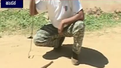 ಹಾಸನ(ಡಿ.27): ಕಪ್ಪೆಯನ್ನು ಹಾವು ನುಂಗುವುದು ಸಾಮಾನ್ಯ. ಆದರೆ, ಹಾಸನದಲ್ಲಿ ಹಾವನ್ನೇ ಹಾವು ನುಂಗಿದ ಪ್ರಸಂಗ ನಡೆದಿದೆ. ಹಾಸನದ ಡೆಂಟಲ್ ಕಾಲೇಜು ಬಳಿ ಇರುವ ಮಂಜುನಾಥ್ ಎಂಬುವರರ ಮನೆ ಎದುರು ಹಾವು ಹಾವನ್ನೇ ನುಂಗಿದ ಪ್ರಸಂಗ ಬೆಳಕಿಗೆ ಬಂದಿದೆ.