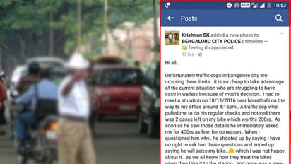 ಈ ಬಗ್ಗೆ ಕೃಷ್ಣ ಎಂಬ ಯುವಕ ಫೇಸ್'ಬುಕ್ ಮೂಲಕ ನಗರ ಪೊಲೀಸ್ ಆಯುಕ್ತರಿಗೆ ದೂರು ನೀಡಿದ್ದಾರೆ. ಇದೇ ತಿಂಗಳ 18ರಂದು ಕೃಷ್ಣ ಮಾರತ್ ಹಳ್ಳಿಯ ರಿಂಗ್ ರೋಡ್ ಬಳಿ ಹೋಗುತ್ತಿದ್ದ ವೇಳೆ ತಡೆದ ಹೆಚ್'ಎಎಲ್ ಸಂಚಾರಿ ಹೆಡ್ ಕಾನ್ಸ್'ಟೇಬಲ್ ಶಿವಮೂರ್ತಿ ತಡೆದಿದ್ದಾರೆ.