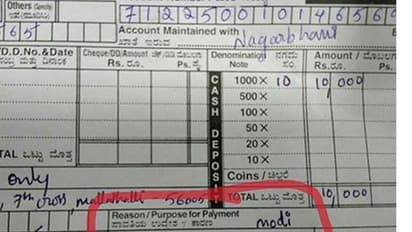 ಇದರ ನಡುವೆ ಹಲವಾರು ಘಟನೆಗಳು ನಡೆಯುತ್ತಿದ್ದು, ಇಲ್ಲೋಬ್ಬ ವ್ಯಕ್ತಿ ಬ್ಯಾಂಕಿಗೆ ಹಣ ಪಾವತಿ ಮಾಡುತ್ತಿರುವ ಉದ್ದೇಶ ಅಥಾವ ಕಾರಣ ಏನೆಂದು ಕೇಳಿದರೆ ಕಾರಣ ಮೋದಿ ಎಂದು ಬರೆದಿದ್ದಾನೆ.