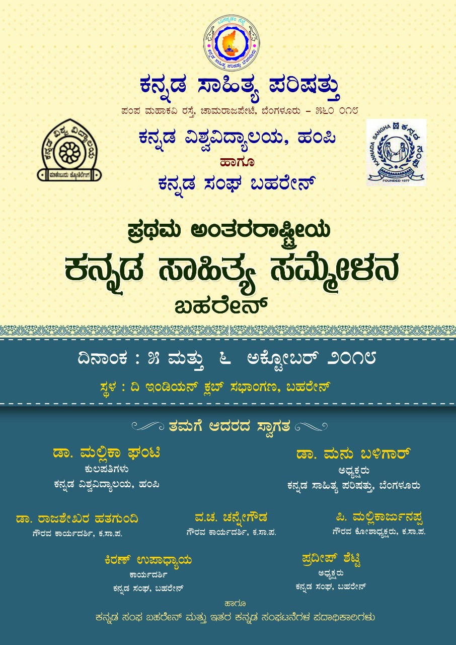 ಅಕ್ಟೋಬರ್ 5 ಮತ್ತು 6 ಅಂದರೆ ಶುಕ್ರವಾರ ಮತ್ತು ಶನಿವಾರ ಪ್ರಥಮ ಅಂತಾರಾಷ್ಟ್ರೀಯ ಕನ್ನಡ ಸಾಹಿತ್ಯ ಸಮ್ಮೇಳನ ಬಹರೇನ್ ನಲ್ಲಿ ನಡೆಯಲಿದೆ. ಕರ್ನಾಟಕ ರಾಜ್ಯ ಸರಕಾರದ ಕನ್ನಡ ಮತ್ತು ಸಂಸ್ಕೃತಿ ಸಚಿವೆ ಡಾ.ಜಯಮಾಲ ಸಮ್ಮೇಳನಕ್ಕೆ ಚಾಲನೆ ನೀಡಲಿದ್ದು ಕನ್ನಡ ಸಾಹಿತ್ಯ ಪರಿಷತ್ತು ಅಧ್ಯಕ್ಚ ಡಾ. ಮನು ಬಳಿಗಾರ್ ಅಧ್ಯಕ್ಷತೆ ವಹಿಸಿಕೊಳ್ಳಲಿದ್ದಾರೆ.