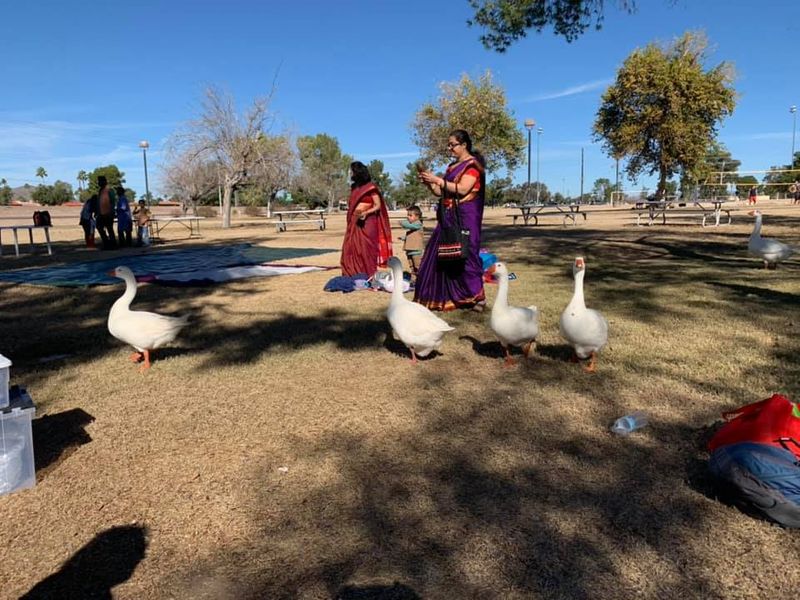 ಸರಿ ಶನಿವಾರ ಮುಂಜಾನೆ ಎಲ್ರೂ ಸ್ಕಾಟ್ಸ್ಡೇಲನ್ಯಾಗಿರೋ ಶಾಪರೆಲ್ ಪಾರ್ಕಿನ್ಯಾಗ ಸೇರಕತ್ವಿ. ಒಬ್ಬೊಬ್ಬರ ಮಂದಿ ಬರಾಕತ್ತಿದ್ರು. ತಾವ್ ಮಾಡ್ಕೊಂಡ್ ಬಂದಿರೋ ಅಡಿಗಿ ತಂದ್ ಟೇಬಲ್ ಮ್ಯಾಲ್ ಜೋಡಸಾಕತ್ರು. ರೊಟ್ಟಿ, ಎಣಗಾಯ್ ಪಲ್ಲೆ, ಜುಣಕ, ಕಾಳಪಲ್ಲೆ, ಪುಂಡಿಪಲ್ಲೆ, ಖಾರಬ್ಯಾಳಿ, ಕಡ್ಲಿಚಟ್ನಿ, ಸೇಂಗಚೆಟ್ನಿ, ಗುರೆಳ್ಪುಡಿ, ಸೇಂಗಾದ್ಹೋಳ್ಗಿ, ಕುಂದ, ಪೇಡೆ, ಗೋಧಿ ಕುಟ್ಟಿದ್ ಪಾಯ್ಸ, ಚಪಾತಿ, ಹಚ್ಕೊಣಾಕ್ ಮಸೂರು ಭಾರಿ ಜಬರ್ದಸ್ತ್ ಊಟ ರೆಡಿ ಆಗಕತ್ತು. ಮತ್ತೀಕಡಿ ಒಂದ್ಮೂರ್ನಾಲ್ಕು ಥರದ್ ಕೋಸಂಬ್ರಿ, ಬಾಳಕ, ಉಪ್ಪಿನಕಾಯಿ ಏನಂತಿರಿ! ಬಂದಿರೋ ಮಂದಿ ಎಲ್ಲ ಭಾಳ ಖುಷಿ ಆಗಿದ್ರು ನೋಡ್ರಿ.
