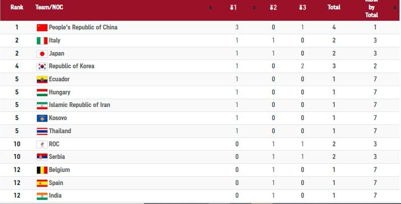 ಚೀನಾ ಪದಕ ಪಟ್ಟಿಯಲ್ಲಿ ಮೊದಲ ಸ್ಥಾನದಲ್ಲಿದೆ. ಚೀನಾ 3 ಚಿನ್ನ ಹಾಗೂ 1 ಕಂಚಿನ ಪದಕದೊಂದಿಗೆ ಒಟ್ಟು 4 ಪದಕ ಗೆದ್ದುಕೊಂಡಿದೆ. ಇಟಲಿ, ಜಪಾನ್, ಕೊರಿಯಾ ತಲಾ ಒಂದೊಂದು ಚಿನ್ನದ ಪದಕ ಗೆದ್ದು ನಂತರದ ಸ್ಥಾನದಲ್ಲಿದೆ.
