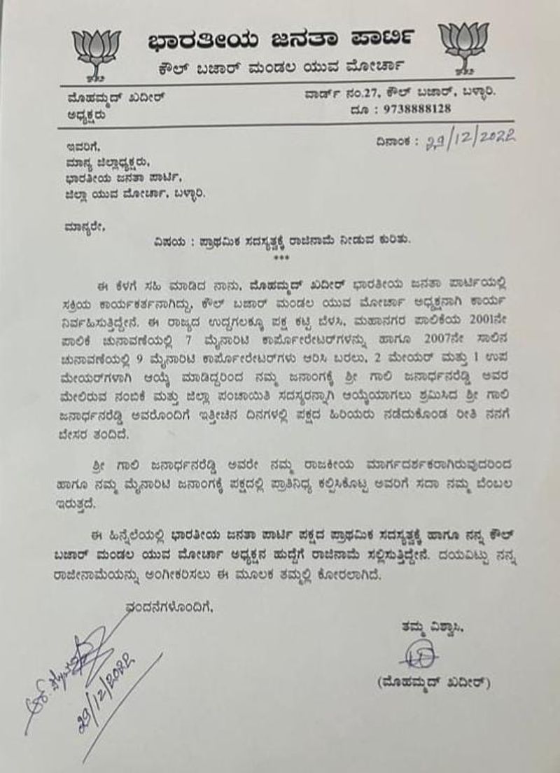 ಬಳ್ಳಾರಿ(ಡಿ.30): ಮಾಜಿ ಸಚಿವ ಜನಾರ್ದನ ರೆಡ್ಡಿ ಬೆಂಬಲಿಸಿ ಬಿಜೆಪಿಯಲ್ಲಿ ರಾಜೀನಾಮೆ ಪರ್ವ ಮುಂದುವರೆದಿದೆ. ಹೌದು, ಬಿಜೆಪಿಯ ಮತ್ತೊಬ್ಬ ಮುಖಂಡ ರಾಜೀನಾಮೆ ನೀಡಿದ್ದಾರೆ. ನಗರದ ಕೌಲ್ ಬಜಾರ್ ಬಿಜೆಪಿ ಮಂಡಲ ಯುವ ಮೋರ್ಚಾ ಅಧ್ಯಕ್ಷ ಮೊಹಮ್ಮದ್ ಖದೀರ್ ರಾಜೀನಾಮೆ ನೀಡಿದ್ದಾರೆ. ಬಿಜೆಪಿ ಪ್ರಾಥಮಿಕ ಸದಸ್ಯತ್ವಕ್ಕೆ ಮೊಹಮ್ಮದ್ ಖದೀರ್ ರಾಜೀನಾಮೆ ಸಲ್ಲಿಸಿದ್ದಾರೆ. ಜನಾರ್ದನ ರೆಡ್ಡಿ ಅವರನ್ನ ಬಿಜೆಪಿ ಪಕ್ಷ ನಡೆಸಿಕೊಂಡ ರೀತಿ ಸರಿಯಿಲ್ಲ ಅಂತ ಬಿಜೆಪಿಗೆ ಮೊಹಮ್ಮದ್ ಖದೀರ್ ಗುಡ್ಬೈ ಹೇಳಿದ್ದಾರೆ. ಇನ್ನಷ್ಟು ಬಿಜೆಪಿ ಮುಖಂಡರು ಇಂದು ರಾಜೀನಾಮೆ ನೀಡುವ ಸಾಧ್ಯತೆ ಇದೆ ಅಂತ ತಿಳಿದು ಬಂದಿದೆ.