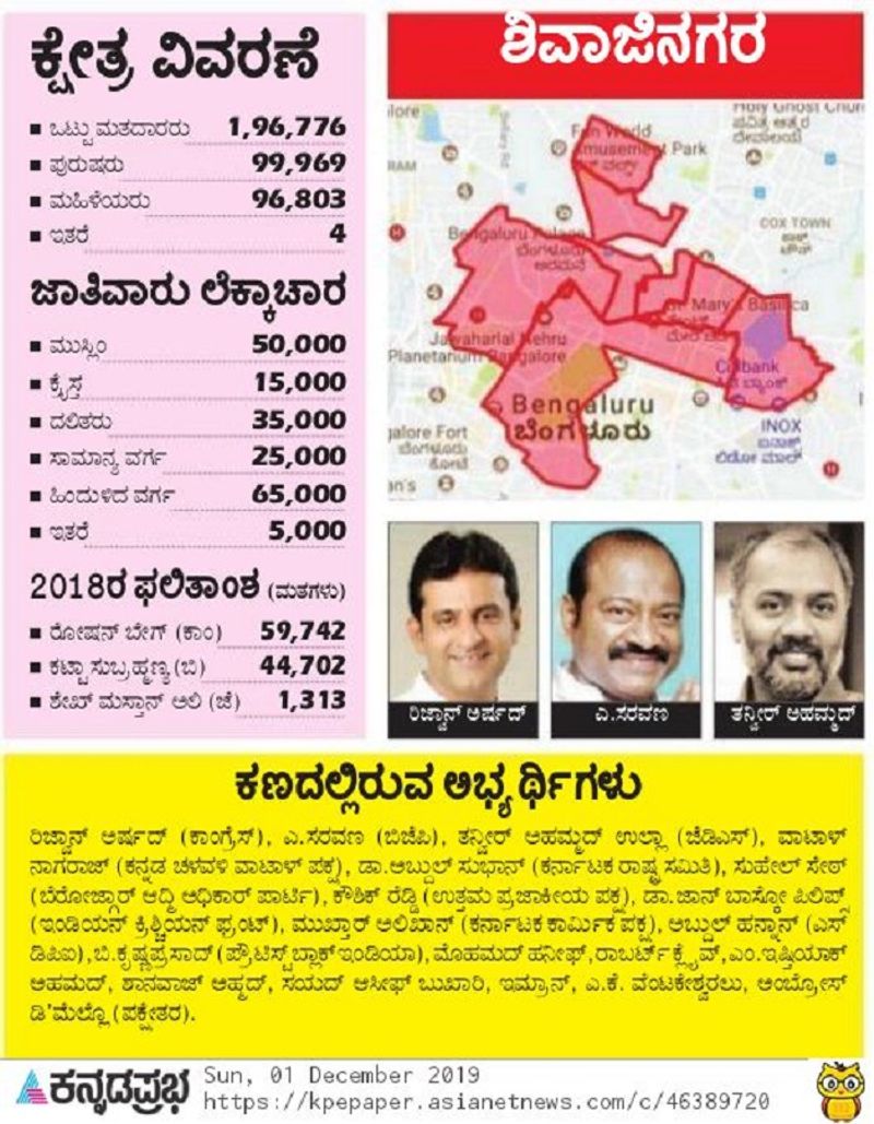 ಬೆಂಗಳೂರು (ಡಿ. 01): ಹಿಂದು, ಮುಸ್ಲಿಂ ಸೇರಿದಂತೆ ಸರ್ವಧರ್ಮೀಯ ಹಾಗೂ ಕನ್ನಡ, ತಮಿಳು, ತೆಲುಗು ಸೇರಿದಂತೆ ಬಹುಭಾಷಾ ಜನರನ್ನು ಒಳಗೊಂಡಿರುವ ಶಿವಾಜಿನಗರ ವಿಧಾನಸಭಾ ಕ್ಷೇತ್ರ ಒಂದು ಮಿನಿಭಾರತ. ಮುಸ್ಲಿಮರು ಮತ್ತು ತಮಿಳರೇ ನಿರ್ಣಾಯಕರಾದ ಕ್ಷೇತ್ರದ ಉಪಚುನಾವಣೆಯಲ್ಲಿ ಬಿಜೆಪಿ ಮತ್ತು ಕಾಂಗ್ರೆಸ್ ನಡುವೆ ನೇರ ಹಣಾಹಣಿ ಏರ್ಪಟ್ಟಿದೆ.