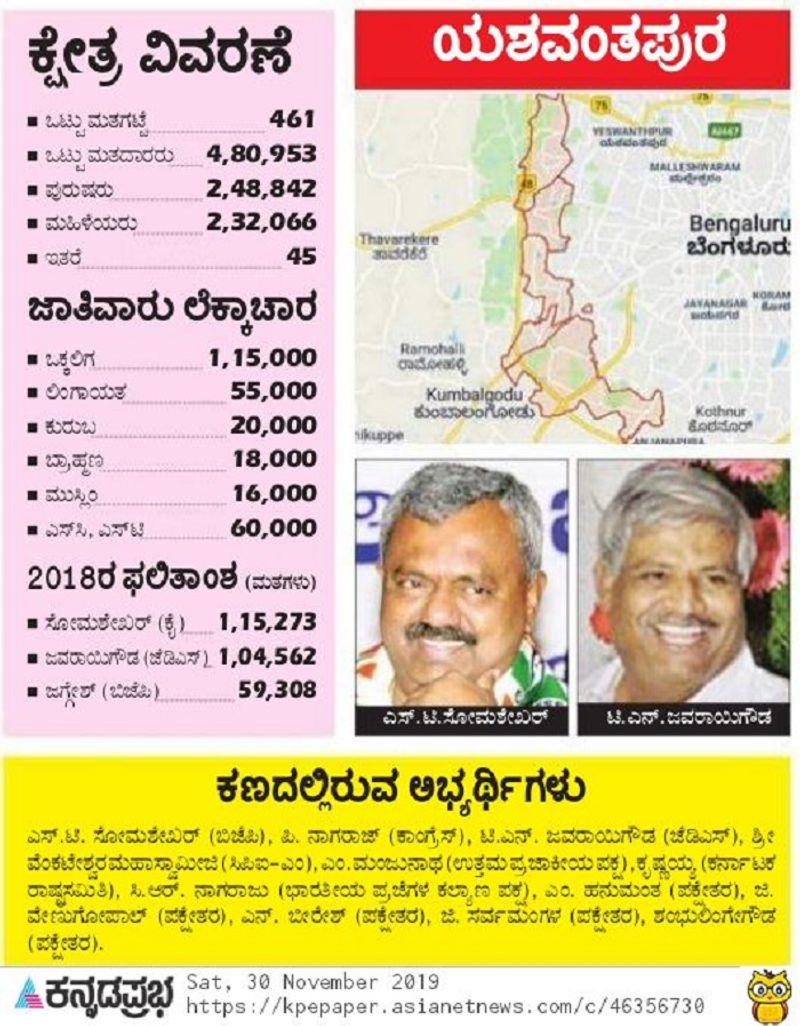 ಉಪ ಚುನಾವಣೆ ಎದುರಿಸುತ್ತಿರುವ ಕ್ಷೇತ್ರಗಳ ಪೈಕಿ 2ನೇ ಅತಿ ಹೆಚ್ಚು ಮತದಾರರ (4.80 ಲಕ್ಷ) ಕ್ಷೇತ್ರ ಯಶವಂತಪುರ. ನಗರ ಹಾಗೂ ಗ್ರಾಮೀಣ ಸೊಗಡಿನ ಸಮ್ಮಿಶ್ರಣದ ಕ್ಷೇತ್ರದಲ್ಲಿ ಕಳೆದ ಎರಡು ಬಾರಿ (2013, 2015) ಕಾಂಗ್ರೆಸ್ನಿಂದ ಶಾಸಕರಾಗಿದ್ದ ಎಸ್.ಟಿ. ಸೋಮಶೇಖರ್ ಪ್ರಸಕ್ತ ಉಪ ಚುನಾವಣೆಯಲ್ಲಿ ಬಿಜೆಪಿ ಹುರಿಯಾಳು. ಹೀಗಾಗಿ ಕ್ಷೇತ್ರದ ರಾಜಕೀಯ ಚಿತ್ರಣವೇ ತಲೆಕೆಳಗಾಗಿದ್ದು, ಪಕ್ಷಗಳ ಬಲಾಬಲವೂ ಭಾರಿ ಪ್ರಮಾಣದಲ್ಲಿ ಅದಲು ಬದಲಾಗಿದೆ.
