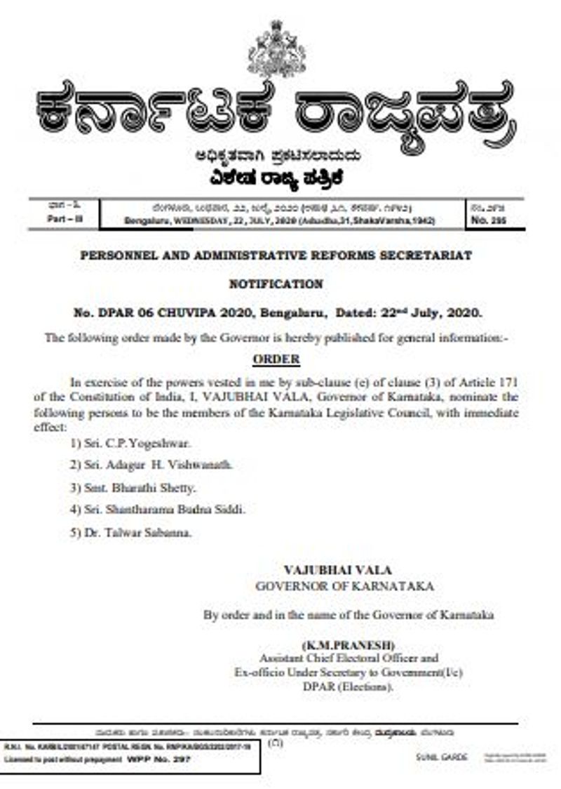 ಸಾಹಿತ್ಯ ಕ್ಷೇತ್ರದಿಂದ ಎಚ್. ವಿಶ್ವನಾಥ್, ಸಿನಿಮಾ ಕ್ಷೇತ್ರದಿಂದ ಸಿ.ಪಿ ಯೋಗೇಶ್ವರ್, ಸಮಾಜ ಸೇವೆ ಕ್ಷೇತ್ರದಿಂದ ಭಾರತಿ ಶೆಟ್ಟಿ, ಶಿಕ್ಷಣ ಕ್ಷೇತ್ರದಿಂದ ಸಾಬಣ್ಣ ತಳವಾರ, ಬುಡಕಟ್ಟು ಕ್ಷೇತ್ರದಿಂದ ಶಾಂತಾರಾಂ ಸಿದ್ದಿರನ್ನು ಪರಿಷತ್ಗೆ ನಾಮನಿರ್ದೇಶನ ಮಾಡಲಾಗಿದೆ.