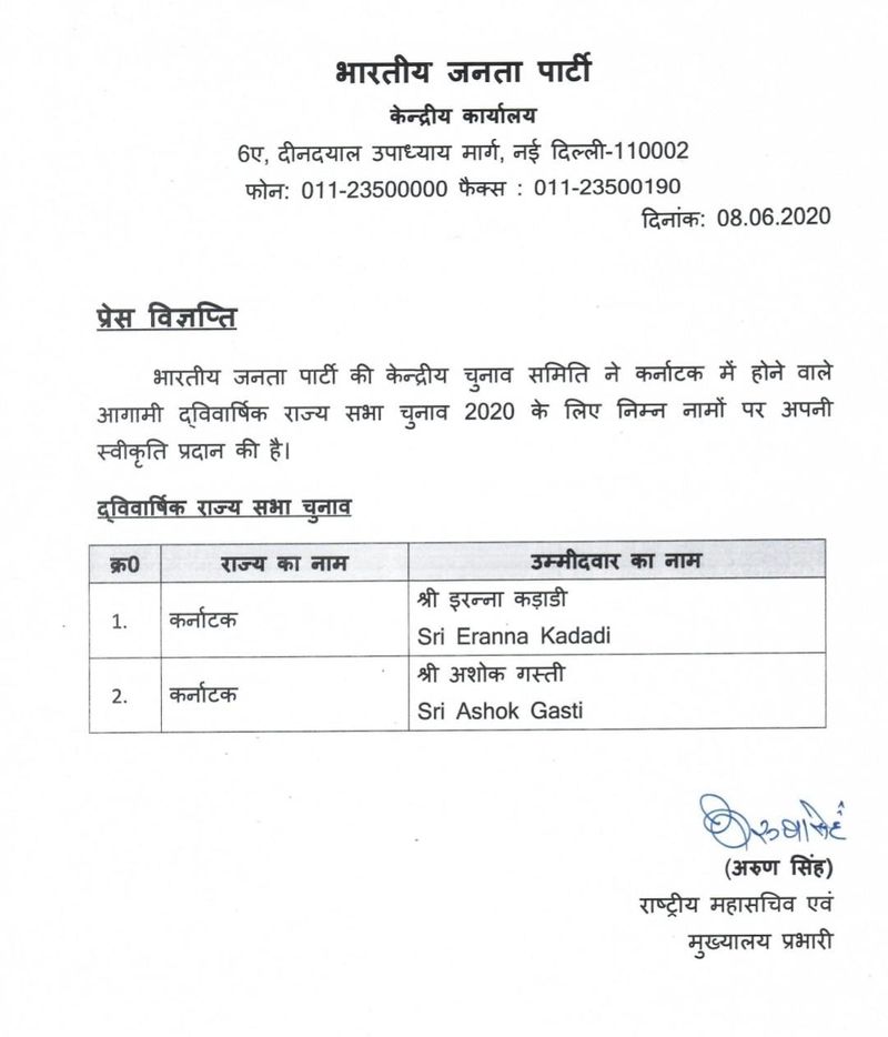 ಹೌದು ಬಿಜೆಪಿಯಲ್ಲಿ ತೀವ್ರ ಕಗ್ಗಂಟಾಗಿದ್ದ ರಾಜ್ಯಸಭಾ ಅಭ್ಯರ್ಥಿ ಸ್ಥಾನಕ್ಕೆ ಕೊನೆಗೂ ಅಭ್ಯರ್ಥಿಗಳ ಘೋಷಣೆ ಮಾಡಲಾಗಿದೆ. ಕರ್ನಾಟಕದಿಂದ ಆಯ್ಕೆ ಮಾಡಿ ಕಳುಹಿಸಿದ ಹೆಸರಿಗೆ ಮನ್ನಣೆ ಕೊಡದೆ, ಸಂಘದ ಹಿನ್ನೆಲೆ ಇರುವ ಇಬ್ಬರು ಹಿರಿಯ ಮುಖಂಡರಿಗೆ ರಾಷ್ಟ್ರೀಯ ನಾಯಕರು ಮಣೆ ಹಾಕಿದ್ದಾರೆ. ಉತ್ತರ ಕರ್ನಾಟಕದಲ್ಲಿ ಪಕ್ಷ ಸಂಘಟನೆ ಮಾಡಿದ ಸಂಘದ ಮುಖಂಡರಲ್ಲಿ ಒಬ್ಬರಾದ ರಾಯಚೂರಿನ ಅಶೋಕ್ ಗಸ್ತಿ ಹಾಗೂ ಬೆಳಗಾವಿ ಜಿಲ್ಲೆಯ ಪ್ರಭಾವಿ ಮುಖಂಡ ಹಾಗೂ ಜಿಲ್ಲಾ ಅಧ್ಯಕ್ಷರಾಗಿ ಕೆಲಸ ಮಾಡಿದ ಈರಣ್ಣ ಕಡಾಡಿ ಹೆಸರನ್ನು ಬಿಜೆಪಿ ಹೈಕಮಾಂಡ್ ಘೋಷಿಸಿದೆ.