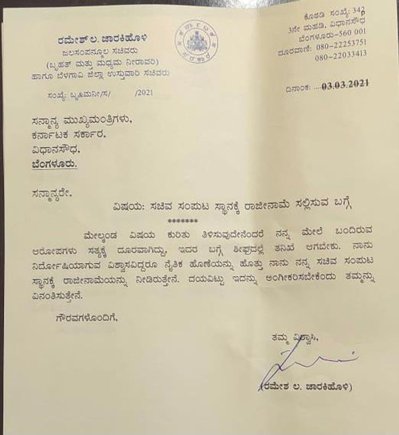 ಬೆಂಗಳೂರು(ಮಾ.03): ಕೆಲಸ ಕೇಳಿ ಬಂದಿದ್ದ ಯುವತಿಯ ಮೇಲೆ ಲೈಂಗಿಕ ದೌರ್ಜನ್ಯ ಎಸಗಿದ್ದಾರೆ ಎಂಬ ಆರೋಪದಡಿ ಸಿಡಿ ವಿವಾದದಲ್ಲಿ ಸಿಲುಕಿದ್ದ ಸಚಿವ ರಮೇಶ ಜಾರಕಿಹೊಳಿ ತಮ್ಮ ಸ್ಥಾನಕ್ಕೆ ರಾಜೀನಾಮೆ ನೀಡಿದ್ದಾರೆ.
