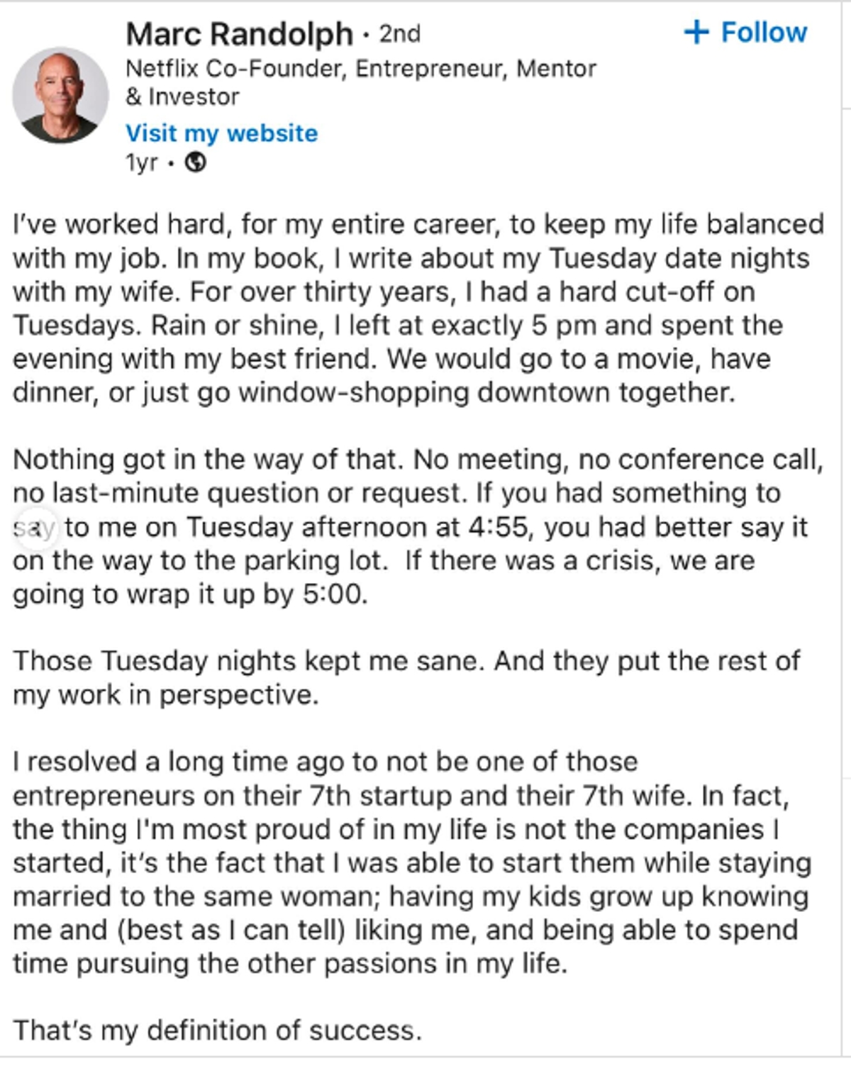 ಯಶಸ್ಸಿಗೆ ಏನು ಮುಖ್ಯ, ಹಣ ಅಥವಾ ಸುಂದರ ಕುಟುಂಬ... ಈ ಬಗ್ಗೆ ಪ್ರಶ್ನೆಗಳು ಏಳುತ್ತಲೇ ಇರುತ್ತದೆ. ಜೀವನದ ತುಂಬಾ ದುಡ್ಡಿನ ಹಿಂದೆಯೇ ಬಿದ್ದು ಸಂಸಾರವನ್ನೂ ತ್ಯಜಿಸಿದವರು, ಕೊನೆಗಾಲದಲ್ಲಿ ಕುಟುಂಬಕ್ಕೆ ಹಂಬಲಿಸೋದನ್ನೂ ನೋಡಿದ್ದೇವೆ. ಇನ್ನು ಹಣಕ್ಕಿಂತ ಕುಟುಂಬವೇ ಮುಖ್ಯ ಎಂದವರು, ಬದುಕು ಸಾಗಿಸಲು ಕಷ್ಟಪಟ್ಟ ಉದಾಹರಣೆಗಳೂ ಇದೆ. ಹಾಗಾಗಿ ಯಶಸ್ಸಿನ ವ್ಯಾಖ್ಯಾನವೇನು ಅನ್ನೋದು ಚರ್ಚೆಯಾಗುತ್ತಲೇ. ಇರುತ್ತದೆ ಇದರ ನಡುವೆ ಪ್ರಪ್ರಂಚದ ಅತಿದೊಡ್ಡ ಒಟಿಟಿ ವೇದಿಕೆಯಾಗಿರುವ ನೆಟ್ಫ್ಲಿಕ್ಸ್ನ ಸಹ ಸಂಸ್ಥಾಪಕ ಹಾಗೂ ಮಾಜಿ ಸಿಇಒ ಮಾರ್ಕ್ ರಾಂಡೋಲ್ಫ್ ಹೇಳಿರುವ ಯಶಸ್ಸಿನ ವ್ಯಾಖ್ಯಾನ ಇಲ್ಲಿ ಮುಖ್ಯವಾಗುತ್ತದೆ. ನನ್ನ ಬ್ಯಾಂಕ್ ಖಾತೆಯಲ್ಲಿನ ಸೊನ್ನೆಗಳ ಸಂಖ್ಯೆಯಿಂದ ಯಶಸ್ಸನ್ನು ನಾನು ಅಳೆಯೋದೇ ಇಲ್ಲ. ಬದಲಿಗೆ, ಆರೋಗ್ಯಕರ ಕೆಲಸ-ಜೀವನದ ಸಮತೋಲನವನ್ನು ಕಾಪಾಡಿಕೊಳ್ಳುವುದರಲ್ಲಿ ನಿಜವಾದ ಯಶಸ್ಸು ಅಡಗಿದೆ ಎಂದು ರಾಂಡೋಲ್ಫ್ ಅರ್ಥ ಮಾಡಿಕೊಂಡಿದ್ದಾರೆ. ಅದಕ್ಕಾಗಿ ಕಳೆದ 30 ವರ್ಷಗಳಿಂದ ನಾನು ಒಂದೇ ರೀತಿಯ ಲೈಫ್ಸ್ಟೈಲ್ ಅಳವಡಿಸಿಕೊಂಡಿದ್ದೇನೆ ಎನ್ನುತ್ತಾರೆ. ಈ ಬಗ್ಗೆ ಲಿಂಕ್ಡಿನ್ನಲ್ಲಿ ಅವರು ಬರೆದುಕೊಂಡಿದ್ದಾರೆ.