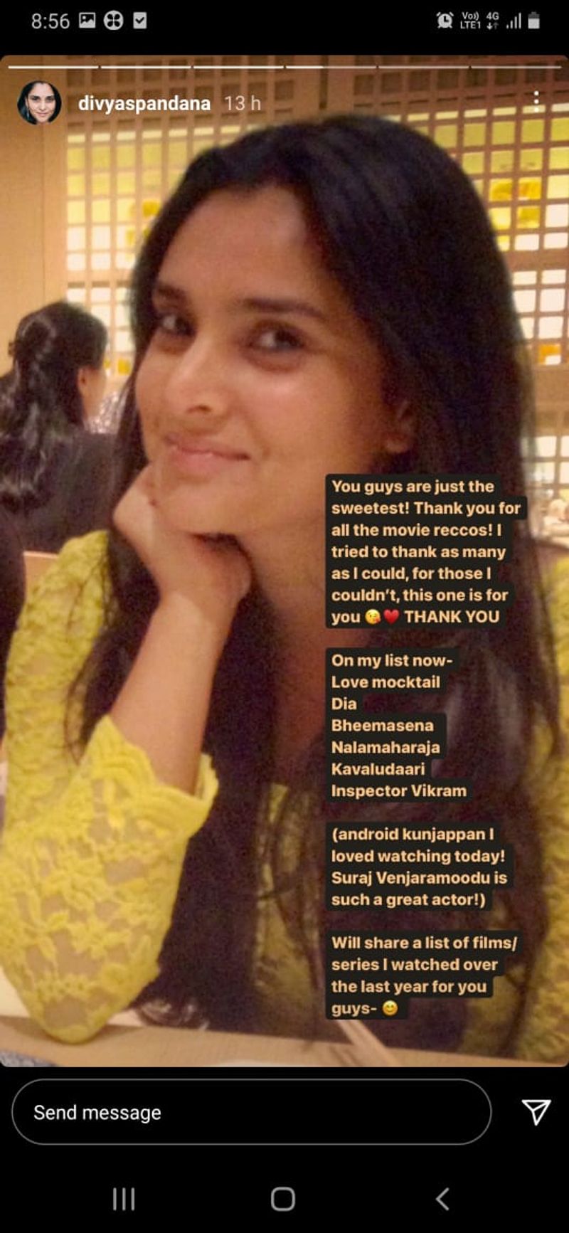 ಇನ್ಸ್ಟಾಗ್ರಾಂ ಸ್ಟೋರಿ ಮೂಲಕ ಅಭಿಮಾನಿಗಳ ಜೊತೆ ಸಂದರ್ಶಿಸಿದ ನಟಿ ರಮ್ಯಾ ಕನ್ನಡ ಚಿತ್ರಗಳ ಮೇಲಿರುವ ಪ್ರೀತಿಯನ್ನು ಈ ಮೂಲಕ ವ್ಯಕ್ತಪಡಿಸಿದ್ದಾರೆ. ಸೋಷಿಯಲ್ ಮೀಡಿಯಾದಲ್ಲಿ ಎಲ್ಲಾ ಭಾಷೆ ಸಿನಿಮಾ ನೋಡುವ ಜನ ಇದ್ದೇ ಇರುತ್ತಾರೆ ಹಾಗೇ ರಮ್ಯಾಗೂ ಬಹಳ ದೊಡ್ಡ ಲಿಸ್ಟ್ ನೀಡಿದ್ದಾರೆ. ಆದರೆ ನಮ್ಮ ಮೋಹಕ ತಾರೆ ಮಾತ್ರ ಕನ್ನಡ ಸಿನಿಮಾಗಳನ್ನೇ ಆಯ್ಕೆ ಮಾಡಿಕೊಂಡಿದ್ದಾರೆ.