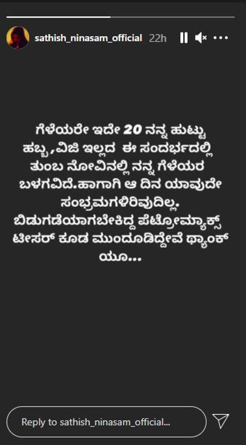 'ಗೆಳೆಯರೇ ಇದೇ 20ರಂದು ನನ್ನ ಹುಟ್ಟುಹಬ್ಬ, ವಿಜಿ ಇಲ್ಲದ ಈ ಸಂದರ್ಭದಲ್ಲಿ ತುಂಬಾ ನೋವಿನಲ್ಲಿ ನನ್ನ ಗೆಳೆಯರ ಬಳಗವಿದೆ. ಹೀಗಾಗಿ ಆ ದಿನ ಯಾವುದೇ ಸಂಭ್ರಮಗಳಿರುವುದಿಲ್ಲ. ಬಿಡುಗಡೆಯಾಗಬೇಕಿದ್ದ ಪೆಟ್ರೋಮ್ಯಾಕ್ಸ್ ಟೀಸರ್ ಕೂಡ ಮುಂದೂಡಿದ್ದೇವೆ. ಥ್ಯಾಂಕ್ ಯೂ..' ಎಂದು ಸತೀಶ್ ಬರೆದುಕೊಂಡಿದ್ದಾರೆ.