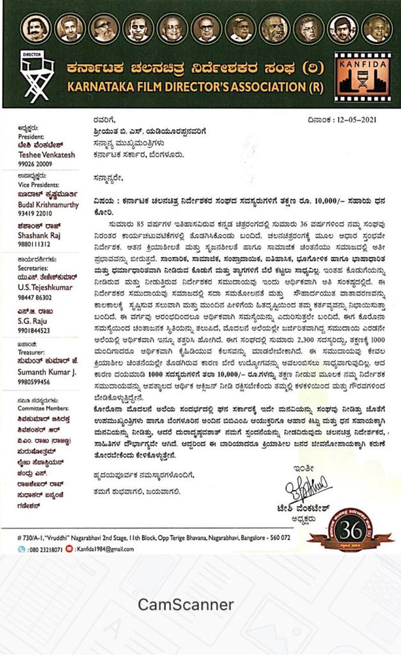 ಈ ಸಮುದಾಯ ಕೇವಲ ಕ್ರಿಯಾಶೀಲ ಚಿಂತನೆಯಲ್ಲೇ ತೊಡಗಿರುವ ಕಾರಣ ಬೇರೆ ಉದ್ಯೋಗವನ್ನು ಅವಲಂಬಿಸಲು ಸಾದ್ಯವಾಗುವುದಿಲ್ಲ. ಆದ ಕಾರಣ 1000 ಸದಸ್ಯರಿಗೆ ತಲಾ 10,000 ರೂಗಳನ್ನು ತಕ್ಷಣವೇ ನೀಡುವ ಮೂಲಕ ನಿರ್ದೇಶಕ ಸಮುದಾಯವನ್ನು ಅಪತ್ಕಾಲದ ಆರ್ಥಿಕ ಆಕ್ಸಿಜನ್ ನೀಡಿ, ರಕ್ಷಿಸಬೇಕೆಂದು ತಮ್ಮಲ್ಲಿ ಕಳಕಳಿಯಿಂದ ಮತ್ತು ಗೌರವಗಳಿಂದ ಬೇಡಿಕೊಳ್ಳುತ್ತೇವೆ ಎಂದು ಪತ್ರದಲ್ಲಿ ಕೇಳಿಕೊಳ್ಳಲಾಗಿದೆ.