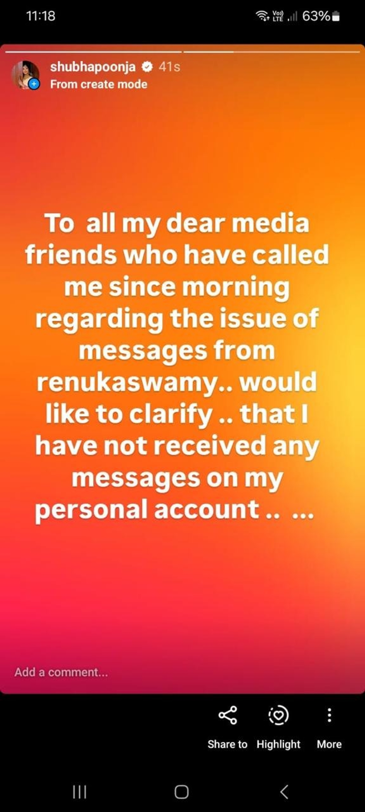 ಈ ಕುರಿತು ಏಷ್ಯಾನೆನಟ್ ಸುವರ್ಣನ್ಯೂಸ್ಗೆ ನಟಿ ಶುಭಾ ಪೂಂಜಾ ಸ್ಪಷ್ಟನೆ ನೀಡಿದ್ದಾರೆ. ರೇಣುಕಾಸ್ವಾಮಿಯಿಂದ ತನಗೆ ಅಶ್ಲೀಲ ಮೆಸೇಜ್ಗಳು ಬಂದಿಲ್ಲ. ಆದರೆ ದರ್ಶನ್ ಗ್ಯಾಂಗ್ ಚಾರ್ಜ್ ಶೀಟ್ನಲ್ಲಿ ತನ್ನ ಹೆಸರು ಯಾಕೆ ಉಲ್ಲೇಖಿಸಿದ್ದಾರೆ ಅನ್ನೋದು ಗೊತ್ತಿಲ್ಲಿ ಎಂದು ಶುಭಾ ಪೂಂಜಾ ಹೇಳಿದ್ದಾರೆ.