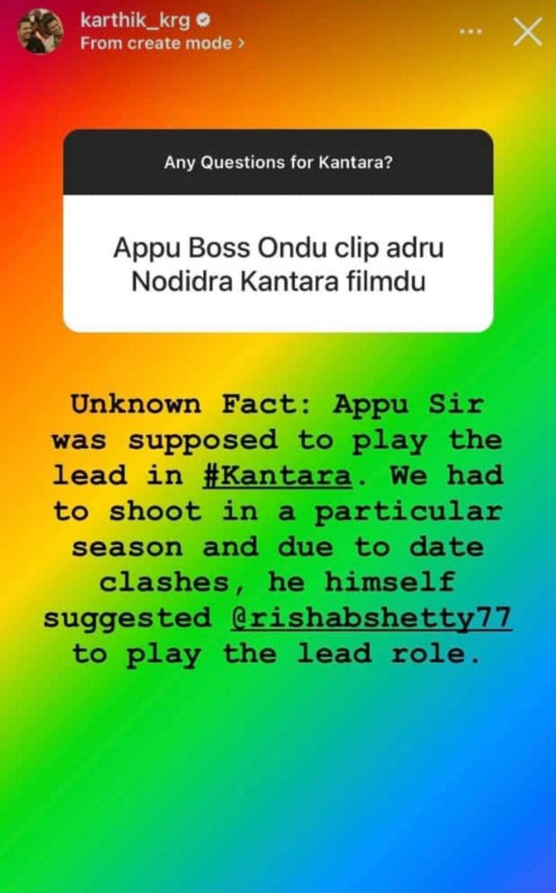 'ಯಾರಿಗೂ ತಿಳಿಯದ ವಿಚಾರ. ಅಪ್ಪು ಸರ್ ಕಾಂತಾರ ಸಿನಿಮಾದಲ್ಲಿ ಲೀಡ್ ಪಾತ್ರದಲ್ಲಿ ನಟಿಸಬೇಕಿತ್ತು. ಒಂದು ನಿಗದಿತ ಅವಧಿಯಲ್ಲಿ ಸಿನಿಮಾ ಚಿತ್ರೀಕರಣ ಮಾಡಬೇಕಿತ್ತು ಆದರೆ ಅಪ್ಪು ಸರ್ಗೆ ದಿನಾಂಕ ಕ್ಲಾಸ ಆಗುತ್ತಿದ್ದ ಕಾರಣ ಅವರೇ ರಿಷಬ್ ಶೆಟ್ಟಿ ಅವರನ್ನು ಲೀಡ್ ಪಾತ್ರಕ್ಕೆ ಆಯ್ಕೆ ಮಾಡಿ ನಟಿಸುವಂತೆ ಸಲಹೆ ಕೊಟ್ಟರು' ಎಂದು ಕಾರ್ತಿಕ್ ಉತ್ತರ ಕೊಟ್ಟಿದ್ದಾರೆ.