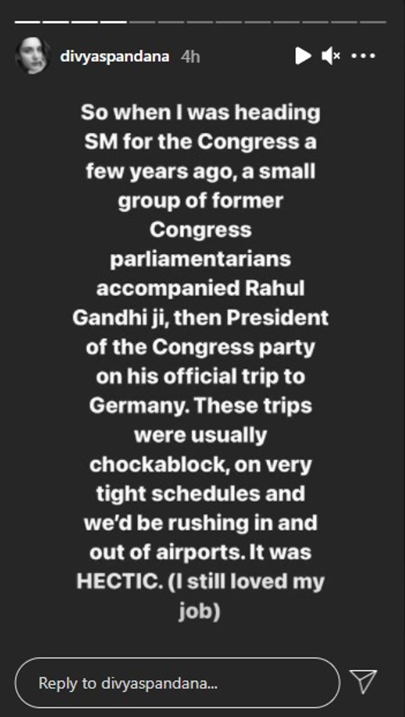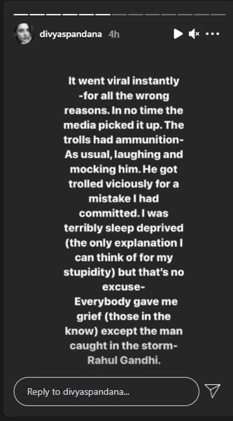 ತಾನು ಕಾಂಗ್ರೆಸ್ ಪಕ್ಷದ ಸೋಶಿಯಲ್ ಮೀಡಿಯಾ ಹೆಡ್ ಆಗಿದ್ದಾಗ ರಾಹುಲ್ ವಿಷಯದಲ್ಲಿ ನಾನು ಒಂದು ತಪ್ಪು ಮಾಡಿದೆ ಎಂದು ರಮ್ಯಾ ಬರೆದುಕೊಂಡಿದ್ದಾರೆ. ಅವರು ಇದನ್ನು ಬರೆದುಕೊಂಡಿರುವುದು ತಮ್ಮ ಇನ್ಸ್ಟಾಗ್ರಾಮ್ ಅಕೌಂಟ್ನ ಸ್ಟೇಟಸ್ನಲ್ಲಿ. ಆ ಘಟನೆ ಯಾವುದು? ಇಲ್ಲಿದೆ ಓದಿ.