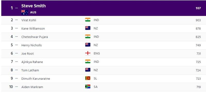 ಸ್ಟೀವ್ ಸ್ಮಿತ್ 937 ರೇಟಿಂಗ್ ಅಂಕದೊಂದಿಗೆ ಮೊದಲ ಸ್ಥಾನದಲ್ಲಿದ್ದರೆ, ವಿರಾಟ್ ಕೊಹ್ಲಿ 903 ಅಂಕಗಳೊಂದಿಗೆ 2ನೇ ಸ್ಥಾನದಲ್ಲಿದ್ದಾರೆ. ಚೇತೇಶ್ವರ್ ಪೂಜಾರ 825 ಅಂಕಗಳೊಂದಿಗೆ 4ನೇ ಸ್ಥಾನ ಹಾಗೂ ಅಜಿಂಕ್ಯ ರಹಾನೆ 7ನೇ ಸ್ಥಾನ ಅಲಂಕರಿಸಿದ್ದಾರೆ.