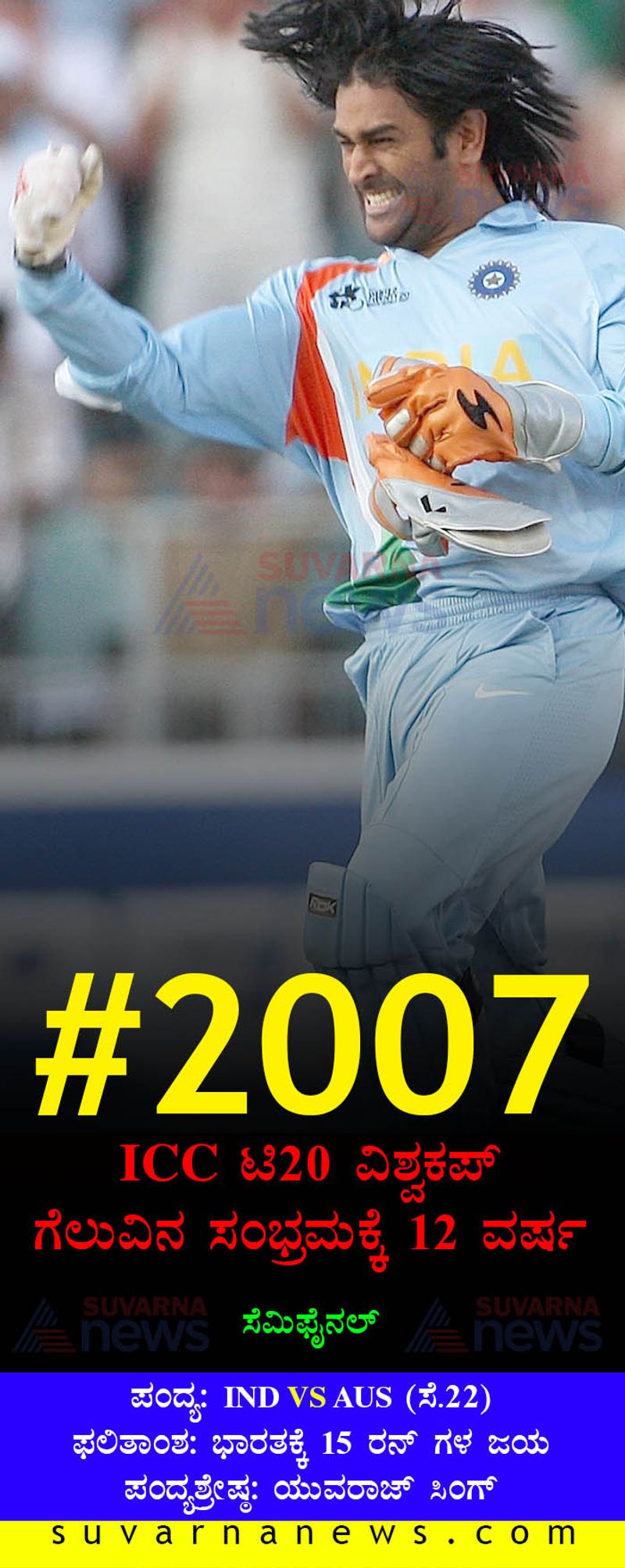ಬೆಂಗಳೂರು[ಸೆ.24]: ಸೆಪ್ಟೆಂಬರ್ 24, 2007 ಭಾರತ ಕ್ರಿಕೆಟ್ ಇತಿಹಾಸವನ್ನು ಸುವರ್ಣಾಕ್ಷರದಲ್ಲಿ ಬರೆದಿಟ್ಟ ದಿನ. ಭಾರತದ ಕ್ರಿಕೆಟ್ಗೆ ಹೊಸ ದಿಕ್ಕು ಸಿಕ್ಕ ದಿನ. ಭಾರತೀಯ ಕ್ರಿಕೆಟ್ ಅಭಿಮಾನಿಗಳು ಸಂಭ್ರಮದ ಹೊಳೆಯಲ್ಲಿ ಮಿಂದೆದ್ದ ದಿನ. ಹೌದು, ಇಂದಿಗೆ 12 ವರ್ಷದ ಹಿಂದೆ ಮಹೇಂದ್ರ ಸಿಂಗ್ ಧೋನಿ ನೇತೃತ್ವದ ಟೀಂ ಇಂಡಿಯಾ ಚೊಚ್ಚಲ ಟಿ20 ವಿಶ್ವಕಪ್ ಟೂರ್ನಿಯ ಫೈನಲ್’ನಲ್ಲಿ ಸಾಂಪ್ರದಾಯಿಕ ಎದುರಾಳಿ ಪಾಕಿಸ್ತಾನ ಎದುರು ಗೆದ್ದು ವಿಶ್ವ ಚಾಂಪಿಯನ್ ಆದ ದಿನ.