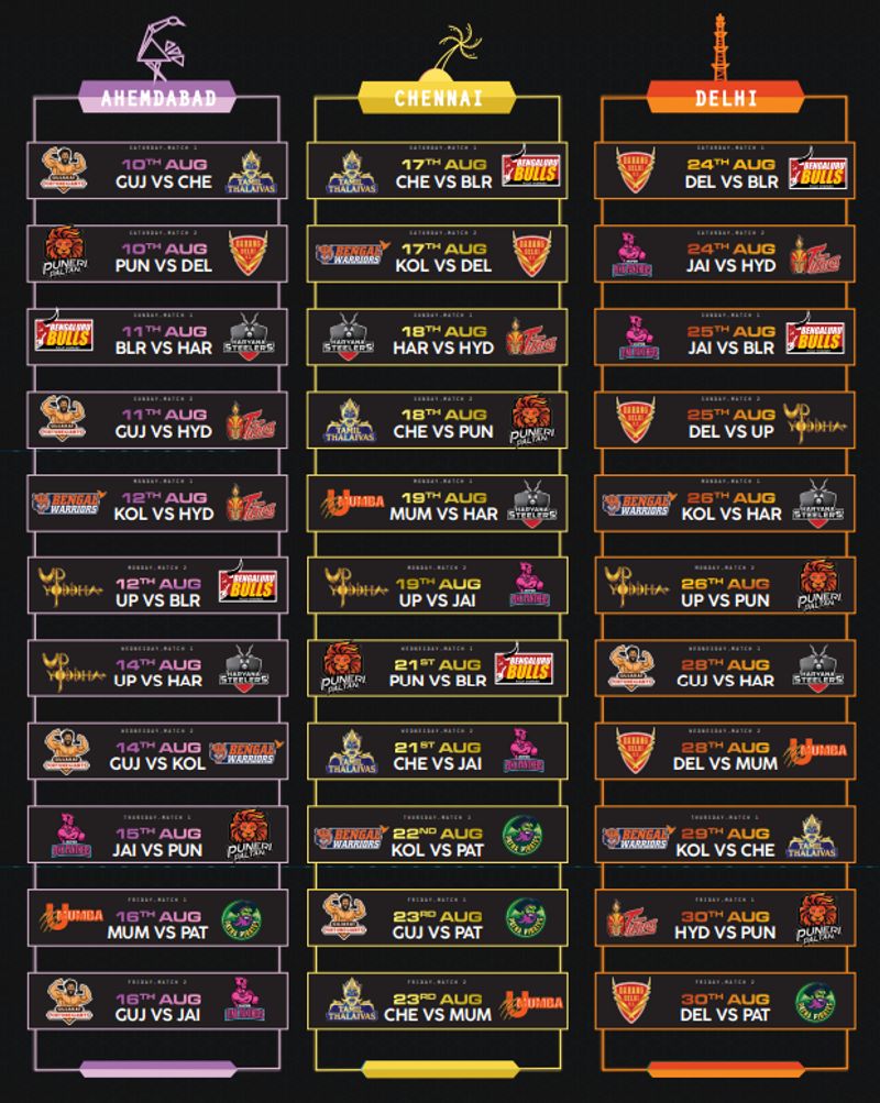 ಜುಲೈ 20 ರಂದು ಆರಂಭಗೊಳ್ಳಲಿರುವ ಪ್ರೊ ಕಬಡ್ಡಿ ಟೂರ್ನಿ ಅಕ್ಟೋಬರ್ 19 ರಂದು ನಡೆಯಲಿರುವ ಫೈನಲ್ ಪಂದ್ಯದೊಂದಿಗೆ ಅಂತ್ಯವಾಗಲಿದೆ. ಜುಲೈ 20ರ 2ನೇ ಪಂದ್ಯದಲ್ಲಿ ಹಾಲಿ ಚಾಂಪಿಯನ್ ಬೆಂಗಳೂರು ಬುಲ್ಸ್ ಹಾಗೂ ಪಾಟ್ನಾ ಪೈರೇಟ್ಸ್ ಮುಖಾಮುಖಿಯಾಗಲಿದೆ.