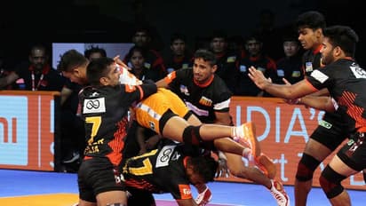 ಪುಣೆ(ಅ.22): ಕೊನೆಯ ಕ್ಷಣದವರೆಗೂ ರೋಚಕತೆ ಕಾಯ್ದುಕೊಂಡ ಪಂದ್ಯದಲ್ಲಿ ಪುಣೇರಿ ಪಲ್ಟನ್ 27-25 ರಿಂದ ಬೆಂಗಳೂರು ಬುಲ್ಸ್ ವಿರುದ್ಧ ಗೆಲುವು ಸಾಧಿಸಿದೆ. ಈ ಮೂಲಕ ಪುಣೆ ತಂಡ ತವರಿನ ಅಂಕಣದಲ್ಲಿ ಹ್ಯಾಟ್ರಿಕ್ ಗೆಲುವು ಪಡೆದರೆ, ಬುಲ್ಸ್ ಕೂಟದಲ್ಲಿ ಮೊದಲ ಸೋಲುಂಡಿತು.