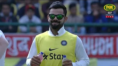 ಧರ್ಮಶಾಲಾ(ಮಾ. 25): ಗಾಯದ ಸಮಸ್ಯೆಯಿಂದ ಆಸ್ಟ್ರೇಲಿಯಾ ಸರಣಿಯಿಂದ ಹೊರಗುಳಿದಿರುವ ವಿರಾಟ್ ಕೊಹ್ಲಿ ಆಟದ ಮೈದಾನದಿಂದ ಮಾತ್ರ ದೂರ ಉಳಿಯುತ್ತಿಲ್ಲ..! ಇಂದು ಆರಂಭಗೊಂಡ ನಾಲ್ಕನೇ ಟೆಸ್ಟ್ ಪಂದ್ಯದಲ್ಲಿ ಫೀಲ್ಡಿಂಗ್ ಮಾಡುತ್ತಿರುವ ಭಾರತೀಯ ಆಟಗಾರರಿಗೆ ವಿರಾಟ್ ಕೊಹ್ಲಿಯೇ ಡ್ರಿಂಕ್ಸ್ ತಂದುಕೊಡುತ್ತಿದ್ದಾರೆ. ಸರಣಿಯ ನಿರ್ಣಾಯಕವಾಗಿರುವ ಈ ಮಹತ್ವದ ಪಂದ್ಯದಲ್ಲಿ ಆಡದೇ ಹೋದರೂ ಡ್ರಿಂಕ್ಸ್ ಕೊಡುವ ನೆವದಲ್ಲಿ ಮೈದಾನದೊಳಗೆ ಹೋಗಿ ಆಟಗಾರರಿಗೆ ಸ್ಫೂರ್ತಿ ತುಂಬುವ ಕಾಯಕವನ್ನು ಕೊಹ್ಲಿ ಮಾಡುತ್ತಿರುವಂತೆ ಕಾಣುತ್ತಿದೆ. ಲವಲವಿಕೆಯಿಂದ ಮೈದಾನದಲ್ಲಿ ಡ್ರಿಂಕ್ಸ್ ಹಿಡಿದು ಕೊಹ್ಲಿ ಓಡಾಡುವ ದೃಶ್ಯ ಎಲ್ಲರ ಮನ ತಟ್ಟಿದೆ.