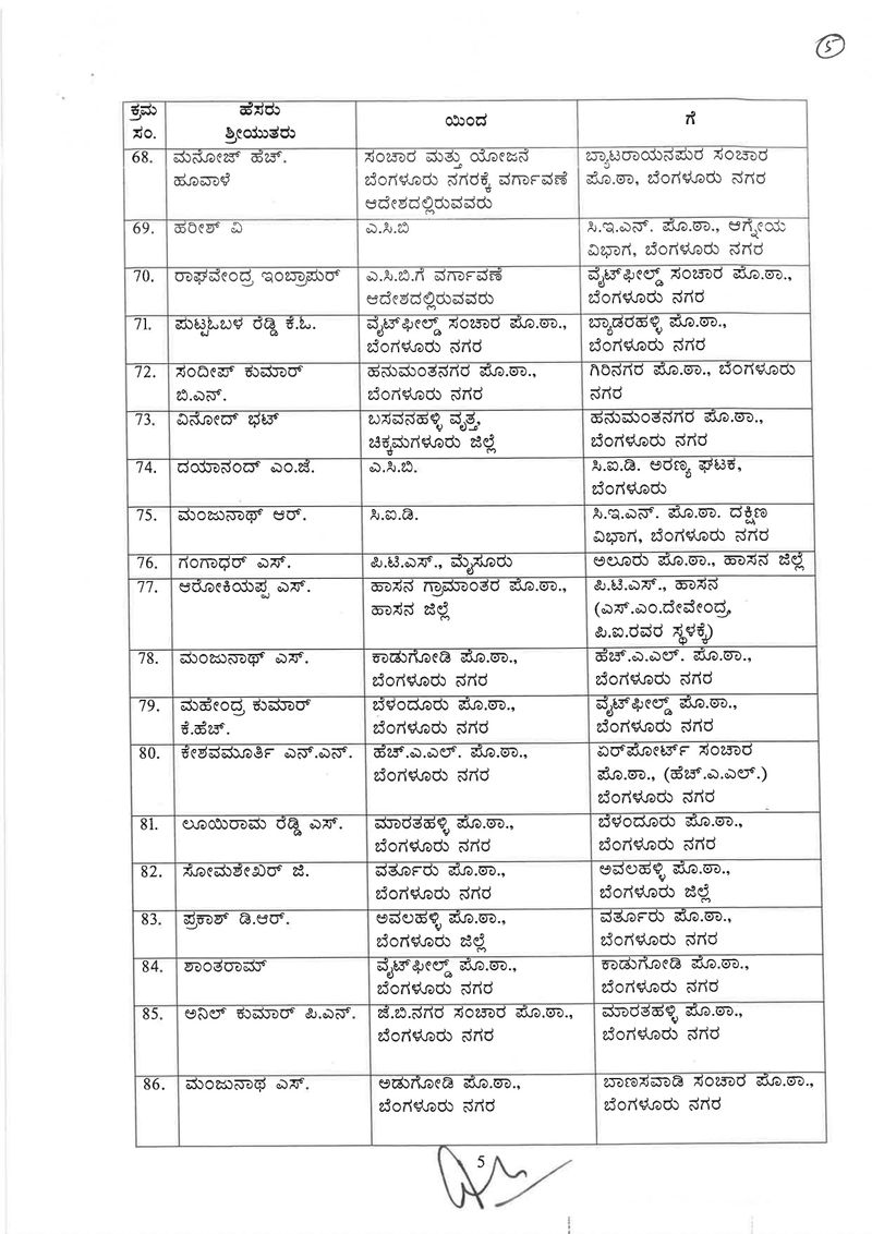ವರ್ಗಾವಣೆಗೊಂಡಿರುವ 103 ಪೊಲೀಸ್ ಇನ್ಸ್ಪೆಕ್ಟರ್ಗಳು: