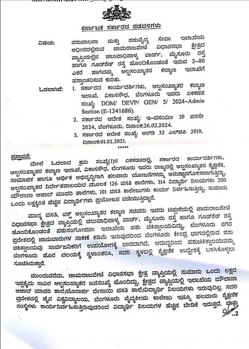 ಪ್ರಸ್ತುತ ರಾಜ್ಯದಲ್ಲಿ ಅಲ್ಪಸಂಖ್ಯಾತರ ನಿರ್ದೇಶನಾಲಯದ ಮೂಲಕ 126 ವಸತಿ ಶಾಲೆಗಳು, 314 ವಿದ್ಯಾರ್ಥಿ ನಿಲಯಗಳು ಹಾಗೂ 200 ಮೌಲಾನಾ ಆಜಾದ್ ಮಾದರಿ ಶಾಲೆಗಳು, 101 ವಸತಿ ಶಾಲೆಗಳು ಕಾರ್ಯನಿರ್ವಹಿಸುತ್ತಿದ್ದು, ಸುಮಾರು 1 ಲಕ್ಷಕ್ಕಿಂತ ಅಧಿಕ ವಿದ್ಯಾರ್ಥಿಗಳು ಪ್ರಯೋಜನ ಪಡೆದುಕೊಳ್ಳುತ್ತಿದ್ದಾರೆ. ಮಾನ್ಯ ವಸತಿ ಹಾಗೂ ವಕ್ಫ್ ಅಲ್ಪಸಂಖ್ಯಾತರ ಸಚಿವರಾಗಿರುವ ಜಮೀರ್ ಅಹ್ಮದ್, ಚಾಮರಾಜಪೇಟೆ ವಿಧಾನಸಭೆ ವ್ಯಾಪ್ತಿಯಲ್ಲಿರುವ ಚೆಲುವಾದಿ ಪಾಳ್ಯ ವಾರ್ಡ್, ಮೈಸೂರು ರಸ್ತೆ ಹಾಗೂ ಗೂಡ್ಶಡ್ ರಸ್ತೆಗೆ ಹೊಂದಿಕೊಂಡಂತೆ ಪಶು ಸಂಗೋಪನಾ ಇಲಾಖೆಯ ಪಶು ಆಸ್ಪತ್ರೆ ಇದೆ. ಆದರೆ, ಬೆಂಗಳೂರು ನಗರ ಪ್ರದೇಶದಲ್ಲಿ ಜಾನುವಾರುಗಳು ಸಾಕಣೆ ಕಡಿಮೆ ಇರುವ ಕಾರಣ, ಬೆಂಗಳೂರು ಕೇಂದ್ರ ಭಾಗದಲ್ಲಿರುವ ಪಶು ಆಸ್ಪತ್ರೆ ಸಾರ್ವಜನಿಕರಿಗೆ ಉಪಯೋಗಕ್ಕೆ ಬಾರದಂತಿದೆ. ಆದ್ದರಿಂದ ಇದನ್ನು ಬೆಂಗಳೂರು ಹೊರ ವಲಯಕ್ಕೆ ಸ್ಥಳಾಂತರ ಮಾಡಿ, ಈ ಪ್ರದೇಶವನ್ನು ಶೈಕ್ಷಣಿಕ ಉದ್ದೇಶಕ್ಕೆ ಬಳಸಿಕೊಳ್ಳುವಂತೆ ಕೇಳಿಕೊಂಡಿದ್ದರು ಎಂದು ಆದೇಶದಲ್ಲಿ ತಿಳಿಸಲಾಗಿದೆ.