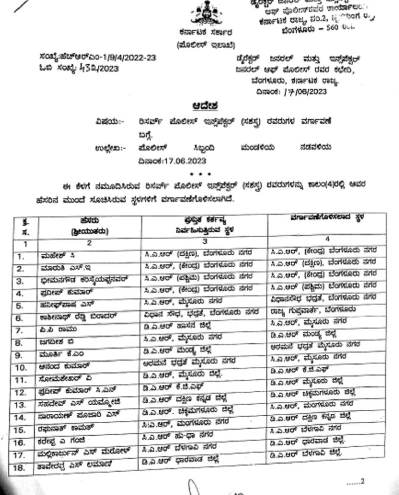ಬೆಂಗಳೂರು (ಜೂ.18): ನೂತನ ಕಾಂಗ್ರೆಸ್ ಸರ್ಕಾರ ಅಸ್ತಿತ್ವಕ್ಕೆ ಬಂದ ಬಳಿಕ ಗೃಹ ಇಲಾಖೆ ಇದೀಗ ರಿಸರ್ವ್ ಪೊಲೀಸ್ ಇನ್ಸ್ಪೆಕ್ಟರ್ಗಳನ್ನೂ ಟ್ರಾನ್ಸ್ಫರ್ ಮಾಡಿದೆ. ರಾಜ್ಯದ 31 ರಿಸರ್ವ್ ಪೊಲೀಸ್ ಇನ್ಸ್ಪೆಕ್ಟರ್ (ಸಶಸ್ತ್ರ)ಗಳ ವರ್ಗಾವಣೆ ಮಾಡಿ ರಾಜ್ಯ ಸರ್ಕಾರ ಆದೇಶ ಹೊರಡಿಸಿದೆ. ಅವರು ಕೆಲಸ ಮಾಡುತ್ತಿದ್ದ ಸ್ಥಳ ಹಾಗೂ ವರ್ಗಾವಣೆಗೊಂಡಿರುವ ಸ್ಥಳದ ವಿವರ ಈ ಕೆಳಗಿನಂತಿದೆ.
