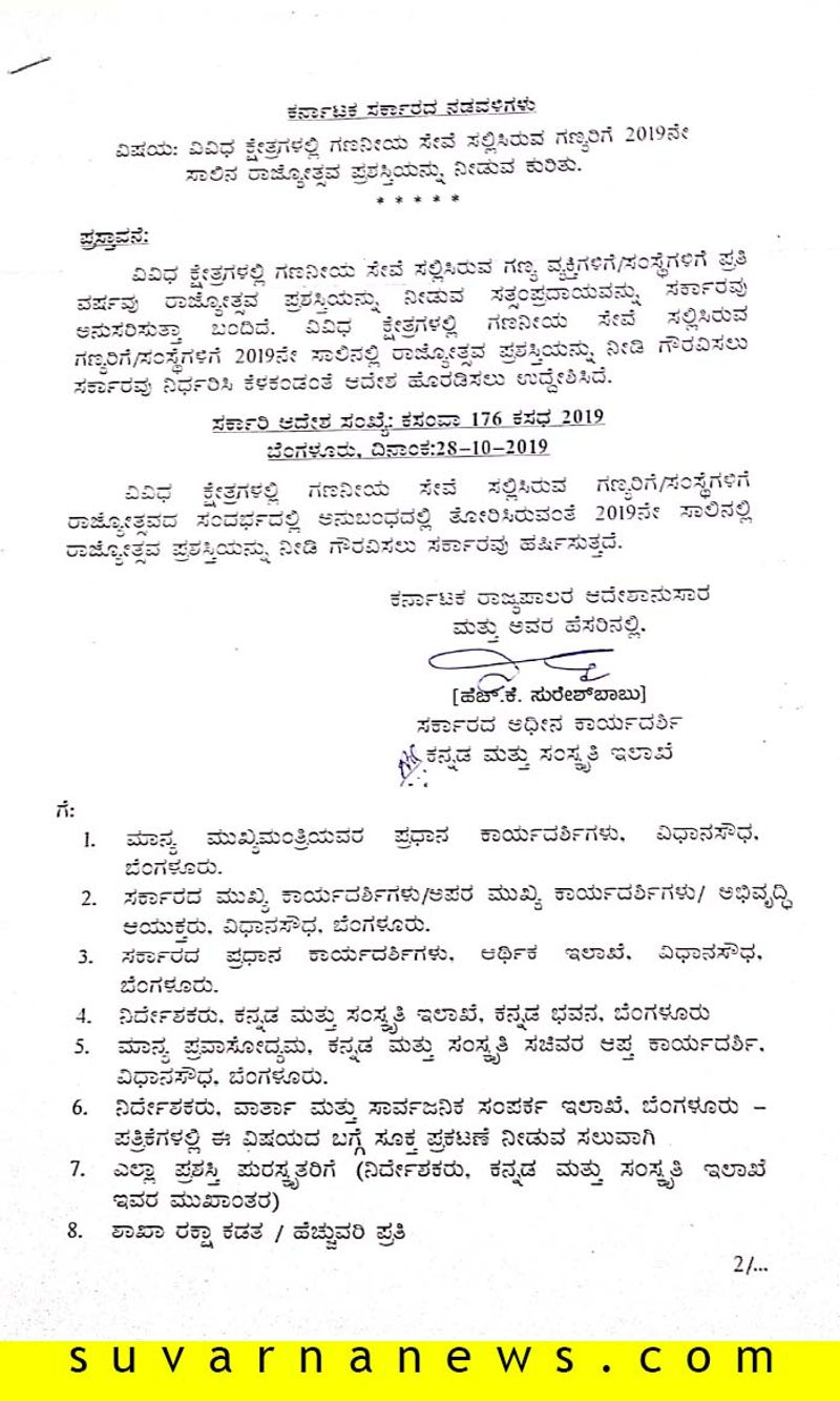 29 ಕ್ಷೇತ್ರಗಳಲ್ಲಿ ಸಾಧನೆ ಮಾಡಿದ ಸಾಧಕರಿಗೆ ಪ್ರಶಸ್ತಿ ಪ್ರಕಟ ಮಾಡಲಾಗಿದೆ. ನವೆಂಬರ್ 1 ಕನ್ನಡ ರಾಜ್ಯೋತ್ಸವ ಸಂದರ್ಭ ಸಾಧಕರಿಗೆ ಪ್ರಶಸ್ತಿ ನೀಡಿ ಗೌರವಿಸಲಾಗುವುದು.