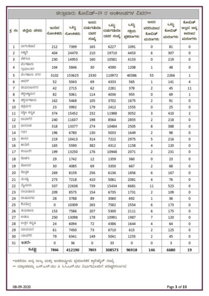 ಬೆಂಗಳೂರು, (ಸೆ.08): ರಾಜ್ಯದಲ್ಲಿ ಇಂದು (ಮಂಗಳವಾರ) 7866 ಜನರಲ್ಲಿ ಸೋಂಕು ಪತ್ತೆಯಾಗಿದೆ. ಮಹಾಮಾರಿಗೆ ಇಂದು 146 ಜನ ಬಲಿಯಾಗಿದ್ದಾರೆ. ಈ ಮೂಲಕ ರಾಜ್ಯದಲ್ಲಿ ಸೋಂಕಿತರ ಸಂಖ್ಯೆ 412190 ಕ್ಕೇರಿಕೆಯಾದರೆ, ಒಟ್ಟು ಸಾವಿನ ಸಂಖ್ಯೆ 6680ಕ್ಕೆ ಏರಿಕೆಯಾಗಿದೆ.