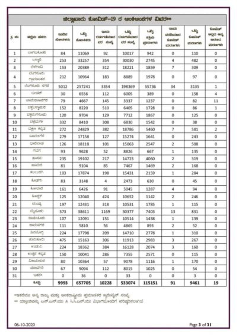 ಬೆಂಗಳೂರು. (ಅ.06): ರಾಜ್ಯದಲ್ಲಿ ಇಂದು (ಮಂಗಳವಾರ) ಹೊಸದಾಗಿ 9,993 ಜನರಿಗೆ ಕೊರೋನಾ ಪಾಸಿಟಿವ್ ಕೇಸ್ಗಳು ಪತ್ತೆಯಾಗಿವೆ.