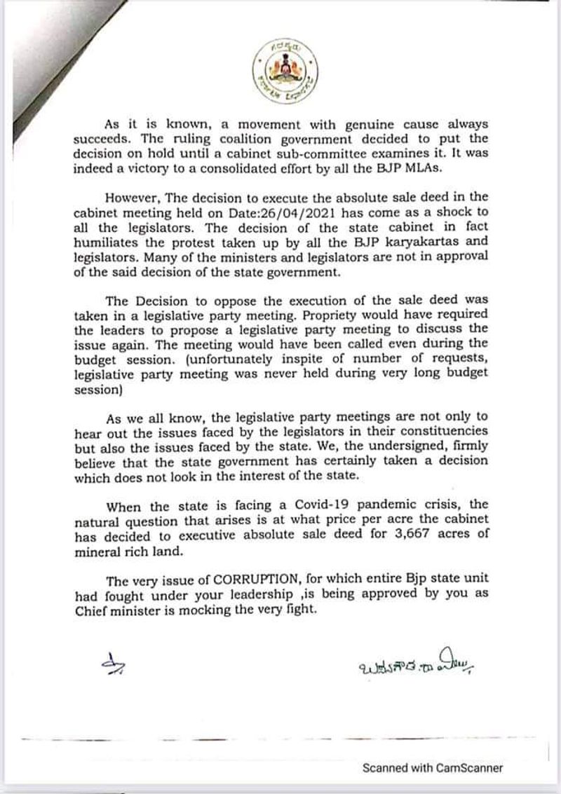 ಕಾಂಗ್ರೆಸ್-ಜೆಡಿಎಸ್ ಮೈತ್ರಿ ಸರ್ಕಾರ ಇದೇ ಜಮೀನನ್ನು ಜಿಂದಾಲ್ಗೆ ಹಸ್ತಾಂತರಿಸಲು ಮುಂದಾಗಿತ್ತು. ಆಗ ಬಿಜೆಪಿ ರಾಜ್ಯಾಧ್ಯಕ್ಷರಾಗಿದ್ದ ನೀವು(ಯಡಿಯೂರಪ್ಪ) ಸೇರಿ ಎಲ್ಲ ಶಾಸಕರು ಪ್ರಕರಣದ ಹಿಂದೆ ದೊಡ್ಡ ಕಿಕ್ಬ್ಯಾಕ್ ವ್ಯವಹಾರ ನಡೆದಿದೆ ಎಂದು ವಿರೋಧಿಸಿದ್ದೆವು. ಜೊತೆಗೆ, ಅಂದಿನ ಸರ್ಕಾರದ ನಿರ್ಧಾರವನ್ನು ಸದನದ ಒಳಗೂ ಮತ್ತು ಹೊರಗೂ ವಿರೋಧಿಸಲು ಬಿಜೆಪಿ ಕೋರ್ ಕಮಿಟಿ ಸಭೆಯಲ್ಲಿ ತೀರ್ಮಾನಿಸಲಾಗಿತ್ತು. ಅಲ್ಲದೆ, ಸದನದಲ್ಲಿ ಅಹೋರಾತ್ರಿ ಧರಣಿ ನಡೆಸಲಾಗಿತ್ತು. ನಮ್ಮ ಹೋರಾಟಕ್ಕೆ ಮಣಿದಿದ್ದ ಅಂದಿನ ಮುಖ್ಯಮಂತ್ರಿ ಎಚ್.ಡಿ.ಕುಮಾರಸ್ವಾಮಿ, ಜಮೀನು ಹಸ್ತಾಂತರಿಸುವ ನಿರ್ಧಾರವನ್ನು ತಾತ್ಕಾಲಿಕವಾಗಿ ಪಕ್ಕಕ್ಕಿಟ್ಟು ಸಚಿವ ಸಂಪುಟ ಉಪ ಸಮಿತಿ ರಚನೆ ಮಾಡಿದ್ದರು.