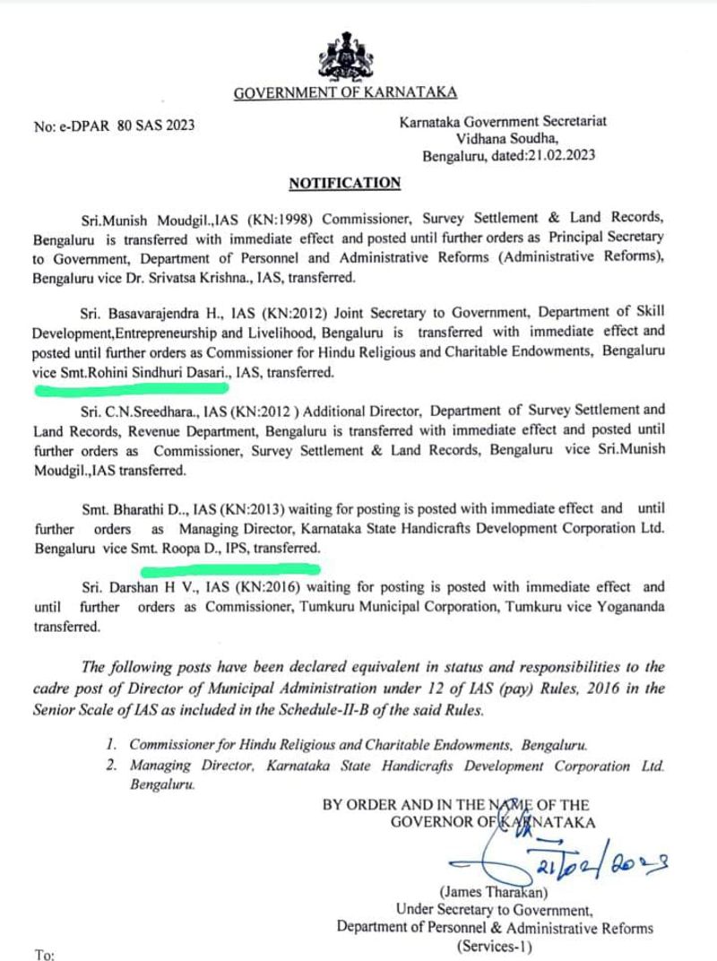 ಅಲ್ಲದೇ ರೂಪಾ ಪತಿ ಮೌನಿಶ್ ಮೌದ್ಗಿಲ್ ಅವರನ್ನು ತಕ್ಷಣವೇ ಜಾರಿಗೆ ಬರುವಂತೆ ಪರ್ಸನಲ್ ಮತ್ತು ಅಡ್ಮಿನಿಸ್ಟ್ರೇಟಿವ್ ರಿಫಾರ್ಮ್ಸ್ ಇಲಾಖೆಯ ಮುಖ್ಯ ಕಾರ್ಯದರ್ಶಿಯಾಗಿ ಮುಂದಿನ ಆದೇಶದವರೆಗೆ ನಿಯೋಜಿಸಲಾಗಿದೆ.
