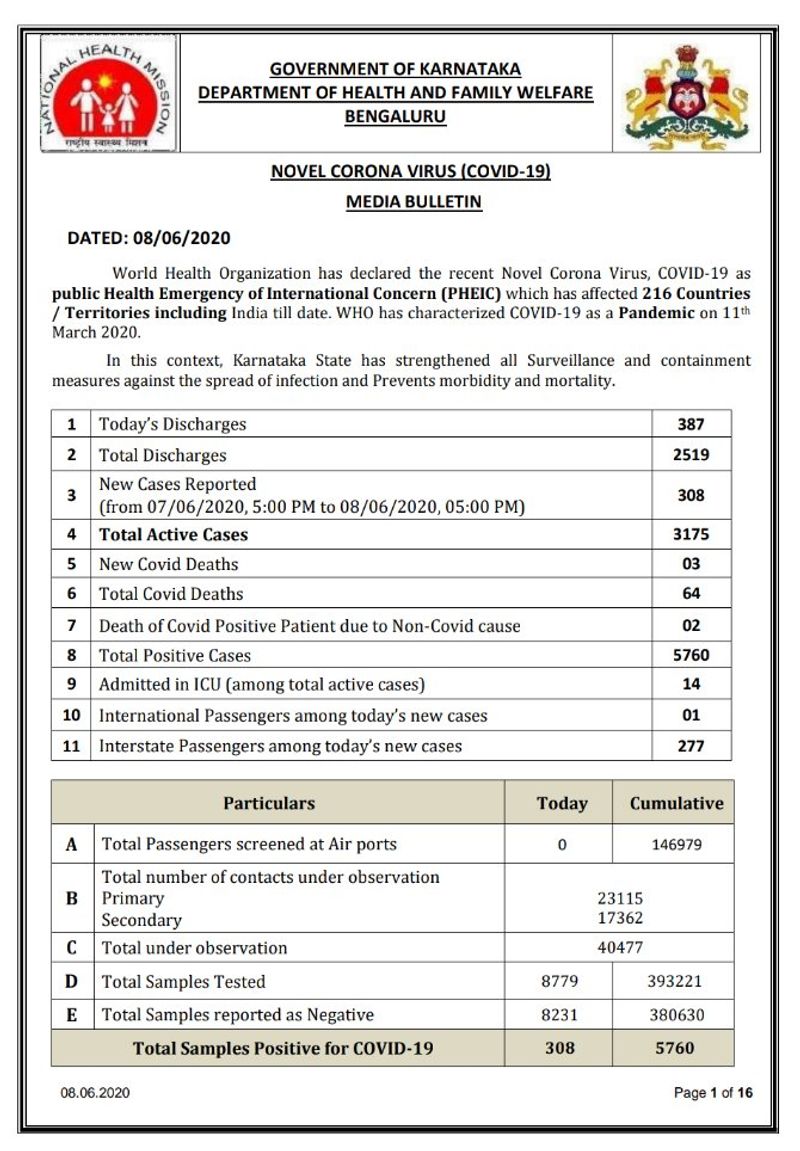 ರಾಜ್ಯದಲ್ಲಿ ಕಳೆದ 24 ಗಂಟೆಗಳ ಅವಧಿಯಲ್ಲಿ 308 ಮಂದಿಗೆ ಕೊರೋನಾ ಸೋಂಕು ತಗುಲಿರುವುದು ದೃಢಪಟ್ಟಿದೆ. ಅದೇ 24 ಗಂಟೆಗಳಲ್ಲಿ 387 ಜನರು ಸೋಂಕಿನಿಂದ ಗುಣಮುಖರಾಗಿ ಆಸ್ಪತ್ರೆಯಿಂದ ಡಿಸ್ಚಾರ್ಜ್ ಆಗಿದ್ದಾರೆ.