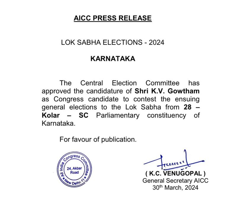 ಕಾಂಗ್ರೆಸ್ನ ಕೇಂದ್ರ ಚುನಾವಣಾ ಸಮಿತಿ, ಎಸ್ಸಿ ಮೀಸಲು ಕ್ಷೇತ್ರವಾಗಿರುವ ಕೋಲಾರದಲ್ಲಿ ಅಭ್ಯರ್ಥಿಯಾಗಿ ಕೆವಿ ಗೌತಮ್ ಅವರ ಹೆಸರನ್ನು ಒಪ್ಪಿದೆ ಎಂದು ಎಐಸಿಸಿ ಪ್ರಧಾನ ಕಾರ್ಯದರ್ಶಿ ಕೆಸಿ ವೇಣುಗೋಪಾಲ್ ಪ್ರಕಟಣೆಯ ಮೂಲಕ ತಿಳಿಸಿದ್ದಾರೆ. ಕೋಲಾರ ಕ್ಷೇತ್ರದಲ್ಲಿ ಬಿಜೆಪಿ-ಜೆಡಿಎಸ್ನ ಮೈತ್ರಿ ಅಭ್ಯರ್ಥಿಯಾಗಿ ಜೆಡಿಎಸ್ನ ಮಲ್ಲೇಶ್ ಬಾಬು ಅವರು ಕಣಕ್ಕೆ ಇಳಿಯಲಿದ್ದಾರೆ.