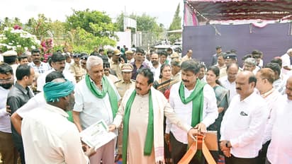 ಚಾಮರಾಜನಗರ (ಜು.04): ಜಿಲ್ಲೆಯ ಹನೂರು ತಾಲೂಕಿನ ರೈತ, ‘ಕನ್ನಡಪ್ರಭ’ ರೈತರತ್ನ ಪ್ರಶಸ್ತಿ ಪುರಸ್ಕೃತ ಪಿ.ದಯಾನಂದ ಅವರ ಹೊಲದಲ್ಲಿ ಕೃಷಿ ಸಚಿವ ಚಲುವರಾಯಸ್ವಾಮಿಯವರು ಗುರುವಾರ ರಾಗಿ ಬಿತ್ತನೆ ಮಾಡುವ ಮೂಲಕ ಈ ಬಾರಿಯ ಕೃಷಿ ಚಟುವಟಿಕೆಗಳಿಗೆ ಚಾಲನೆ ನೀಡಿದರು. ಪಂಚೆ-ಜುಬ್ಬಾ ಧರಿಸಿ ಬಂದಿದ್ದ ಸಚಿವರಿಗೆ ಹಸಿರು ಶಾಲು ಹೊದಿಸಿ ಕೃಷಿ ಇಲಾಖೆಯ ಅಧಿಕಾರಿಗಳು ಸ್ವಾಗತ ಕೋರಿದರು. ಬಳಿಕ, ಸಚಿವರು ಎತ್ತುಗಳಿಗೆ ನಮಸ್ಕರಿಸಿ, ನೇಗಿಲು ಹಿಡಿದು ರಾಗಿ ಬಿತ್ತಿದರು. ಜಿಲ್ಲಾ ಉಸ್ತುವಾರಿ ಸಚಿವ ಕೆ.ವೆಂಕಟೇಶ್ ಹಾಗೂ ಶಾಸಕ ಎಂ.ಆರ್. ಮಂಜುನಾಥ್ ಸಚಿವರಿಗೆ ಸಾಥ್ ನೀಡಿದರು.